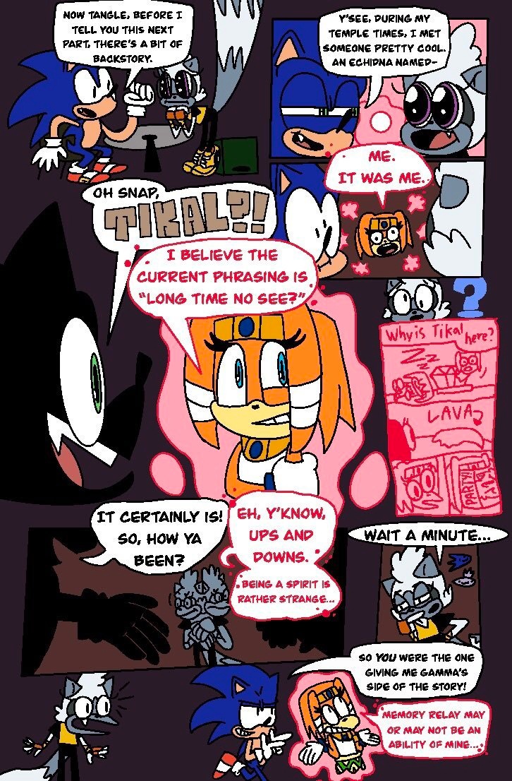 Yes, please do more of Sonic telling Tangle his stories! This was hilarious! Lol her “?” tail! TIKAL IS BACK!! 😀