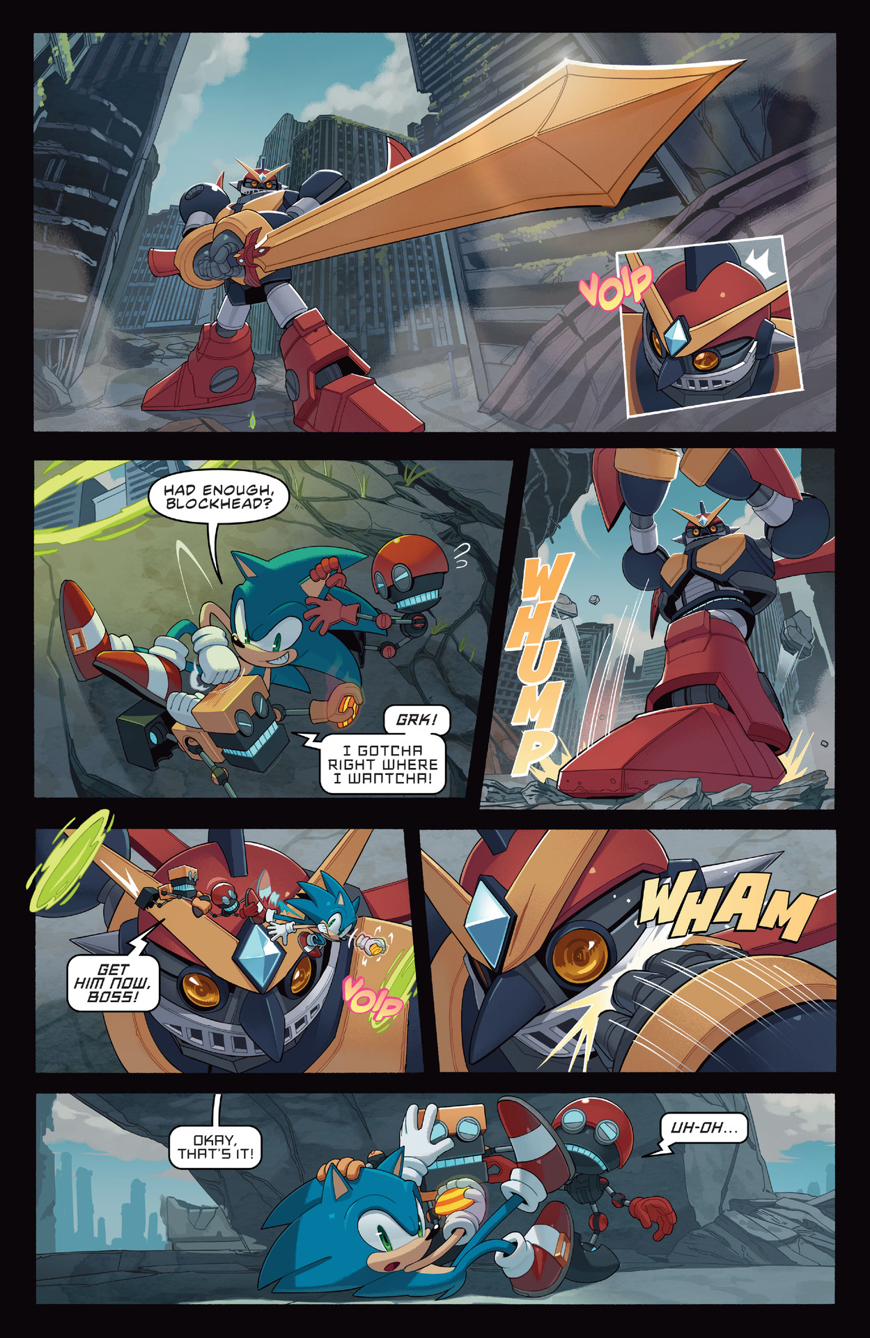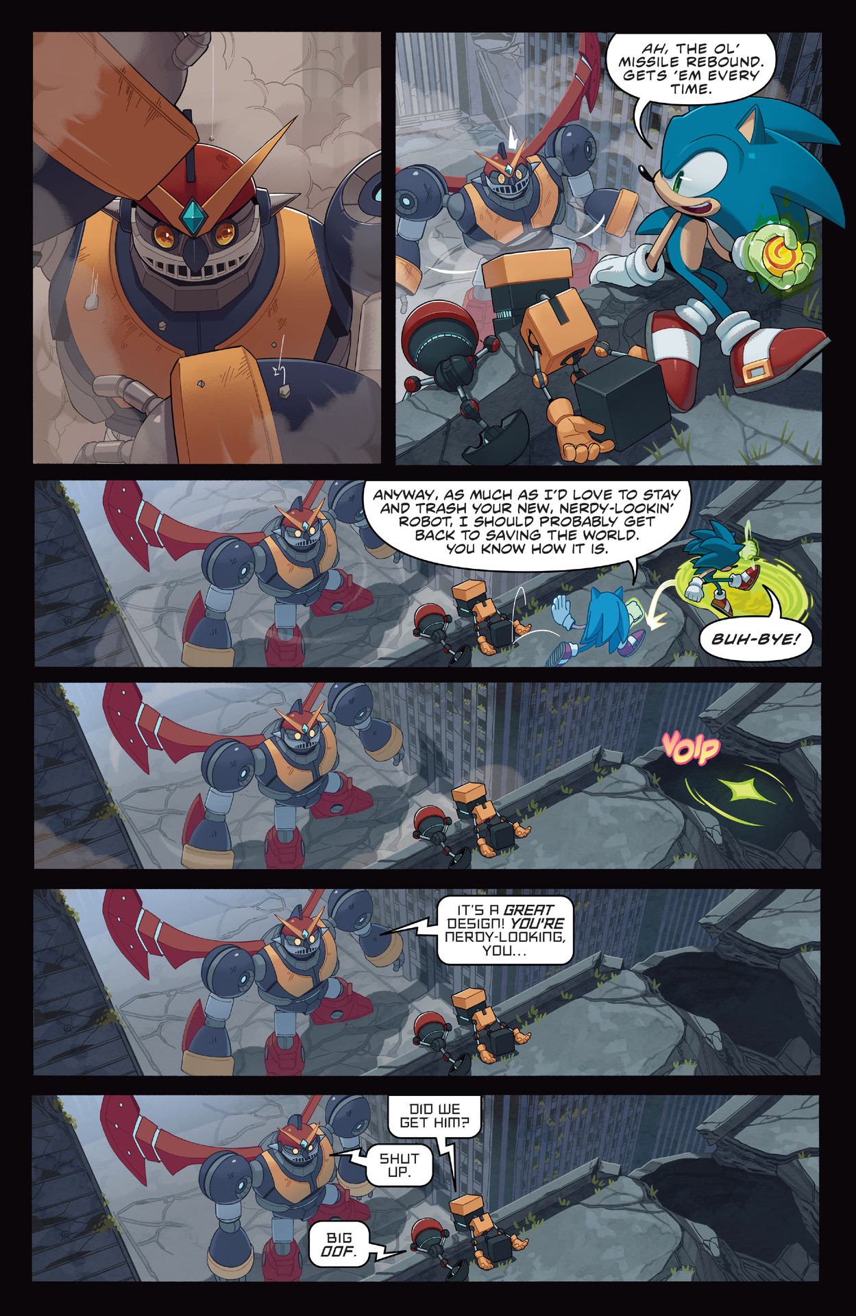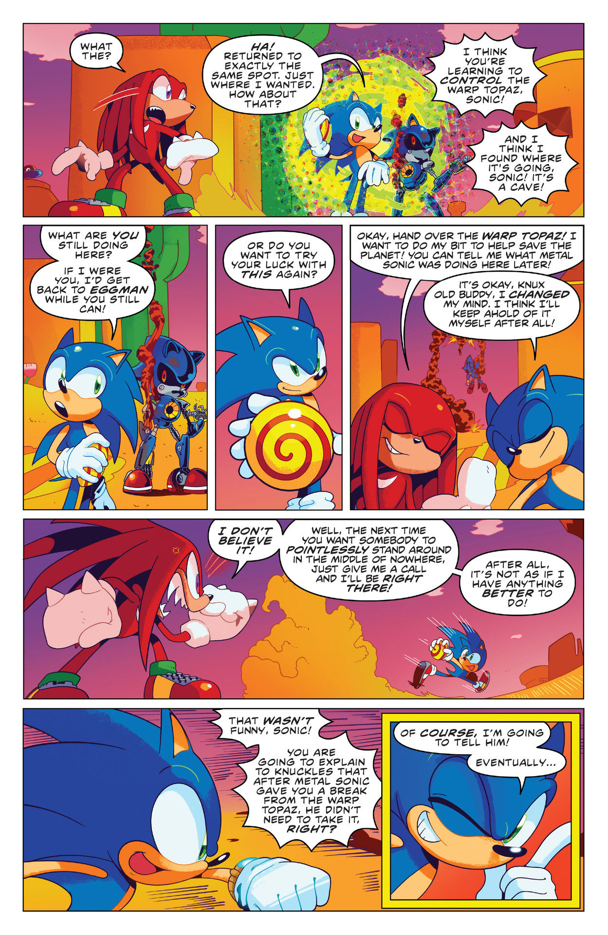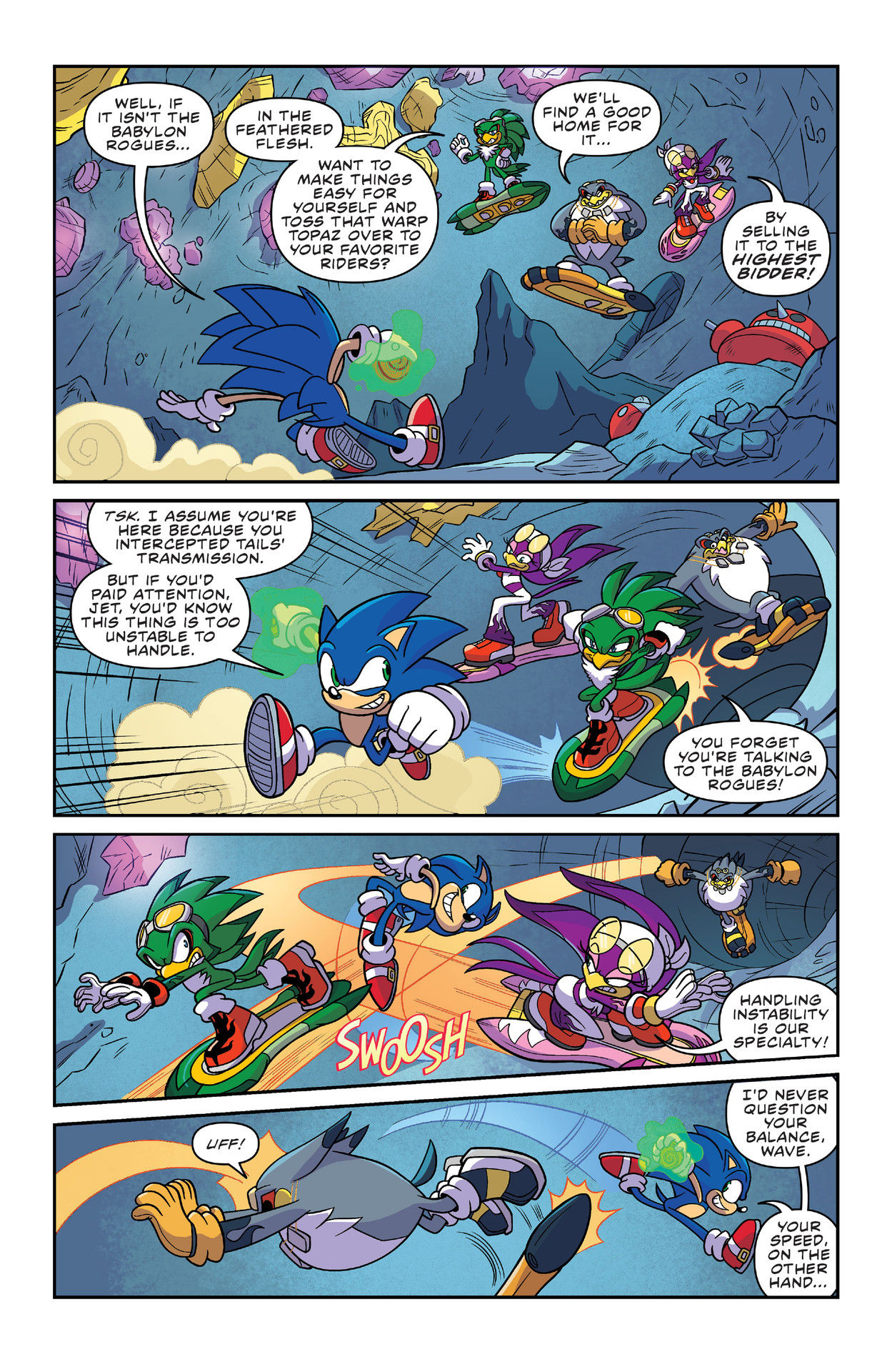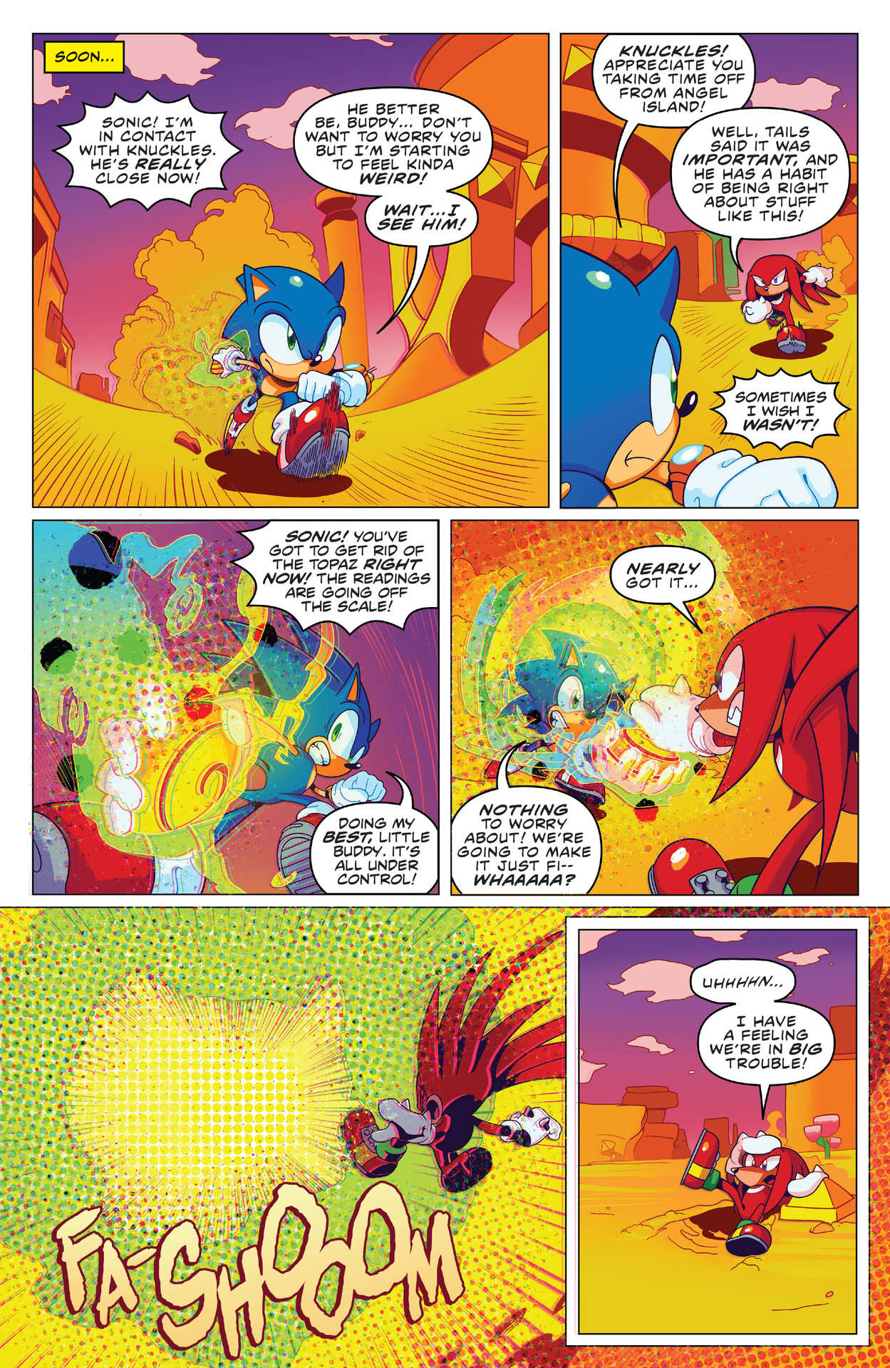 Nice issue! Poor Knuckles; stopped his duty of defending the Master Emerald and went all the way out there to help Sonic, only for Sonic to turn him down and have Knuckles waste his time lol. Also, love the face Rouge was making in the two panels where Shadow was about to punch the Babylon Rogues into the sky and have a “Team Rocket blasting off again!” montage. Rouge was just smiling at them like she knew what was about to happen.