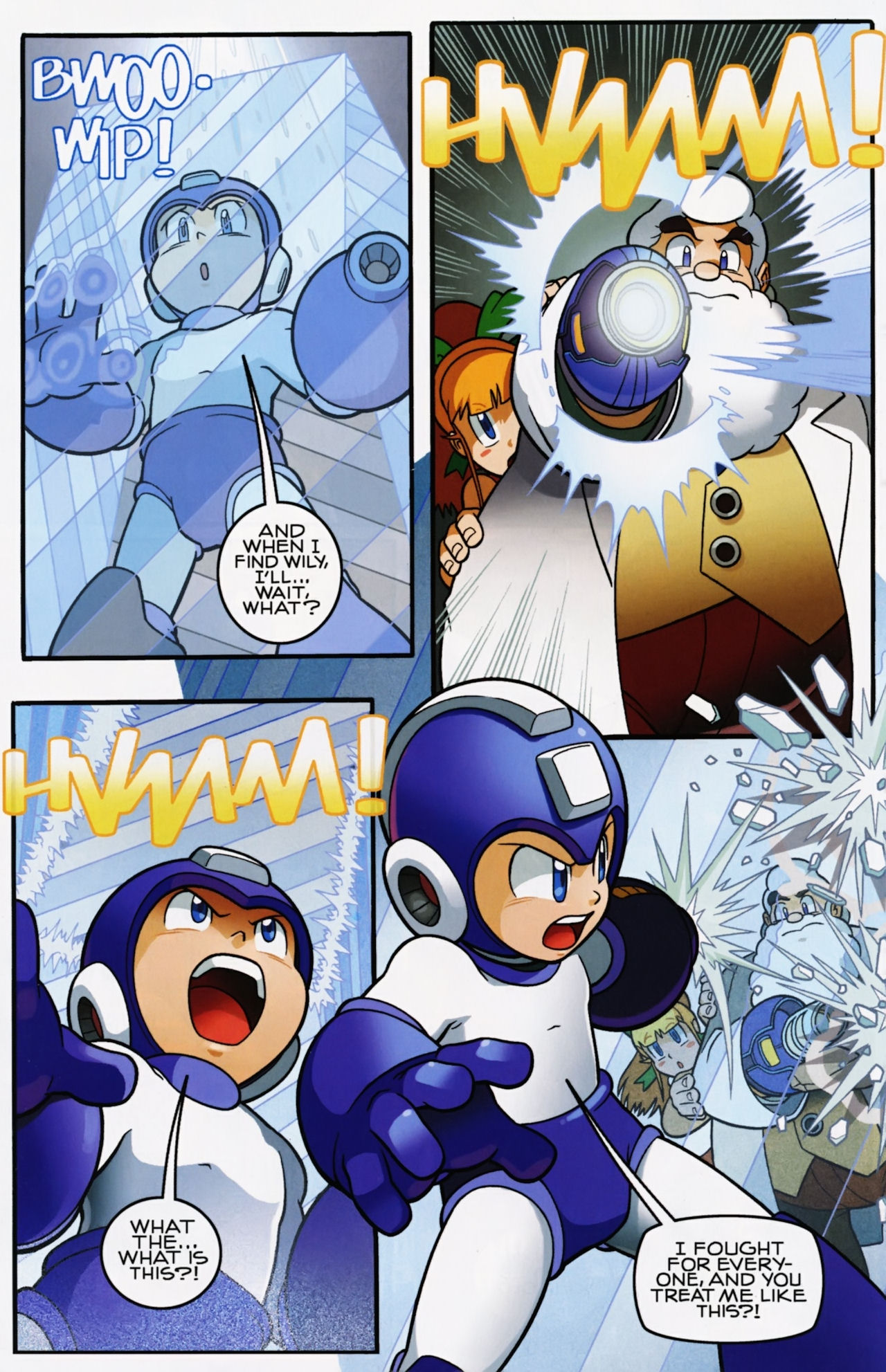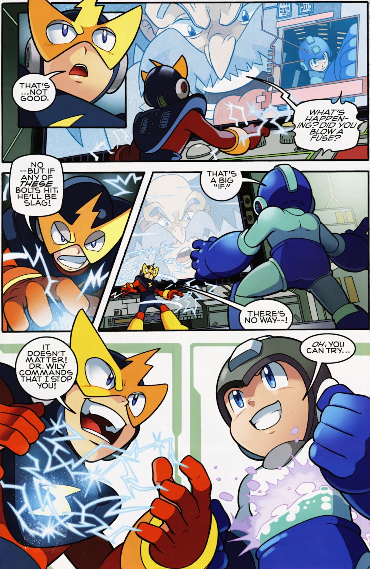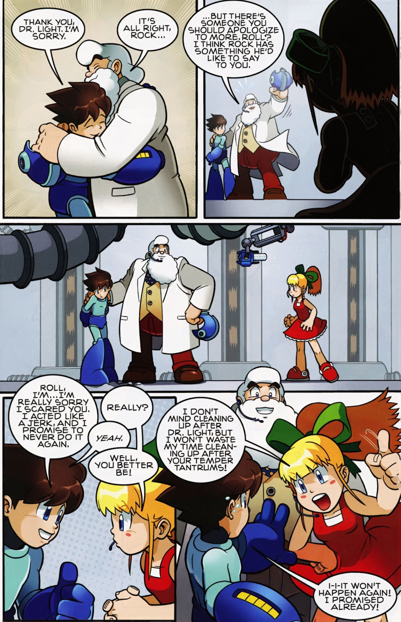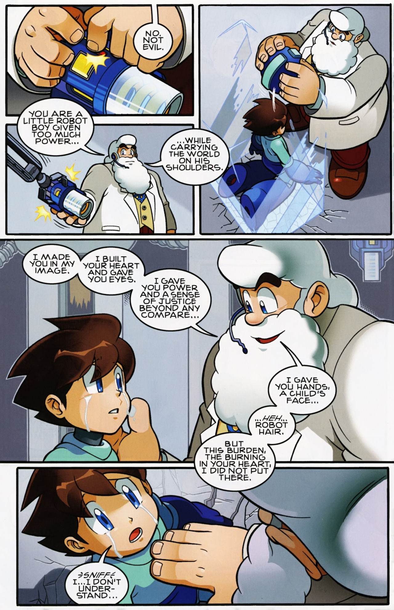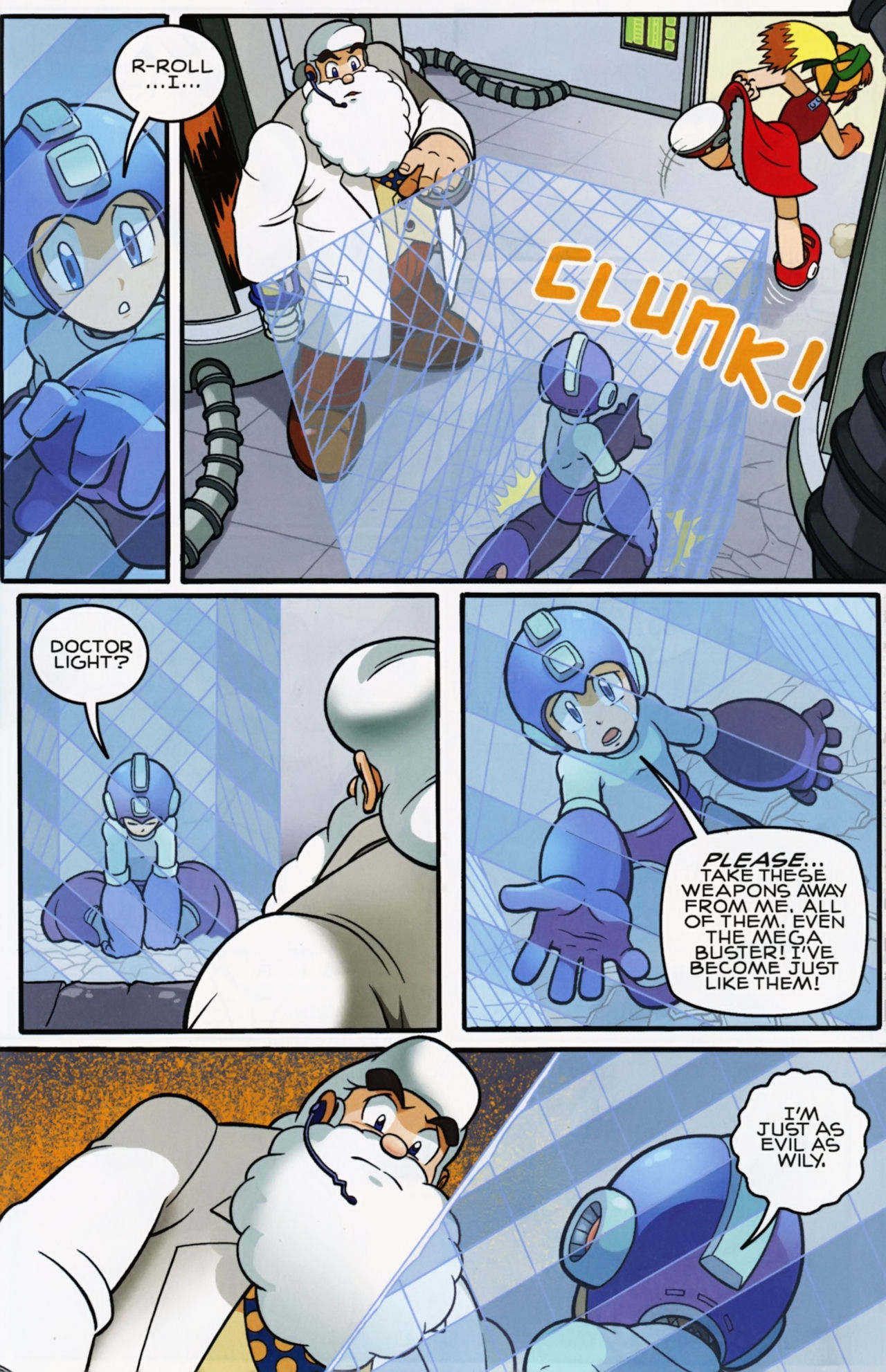 Really don’t like how short the Robot Masters fights are in the Mega Man 1 arc. They not only last about page, but the Robot Masters are also taken out in one hit! Lame! But that said, I do love the scenes between Mega Man and Dr. Light and Roll. And the nods to the Megas are very much appreciated.
