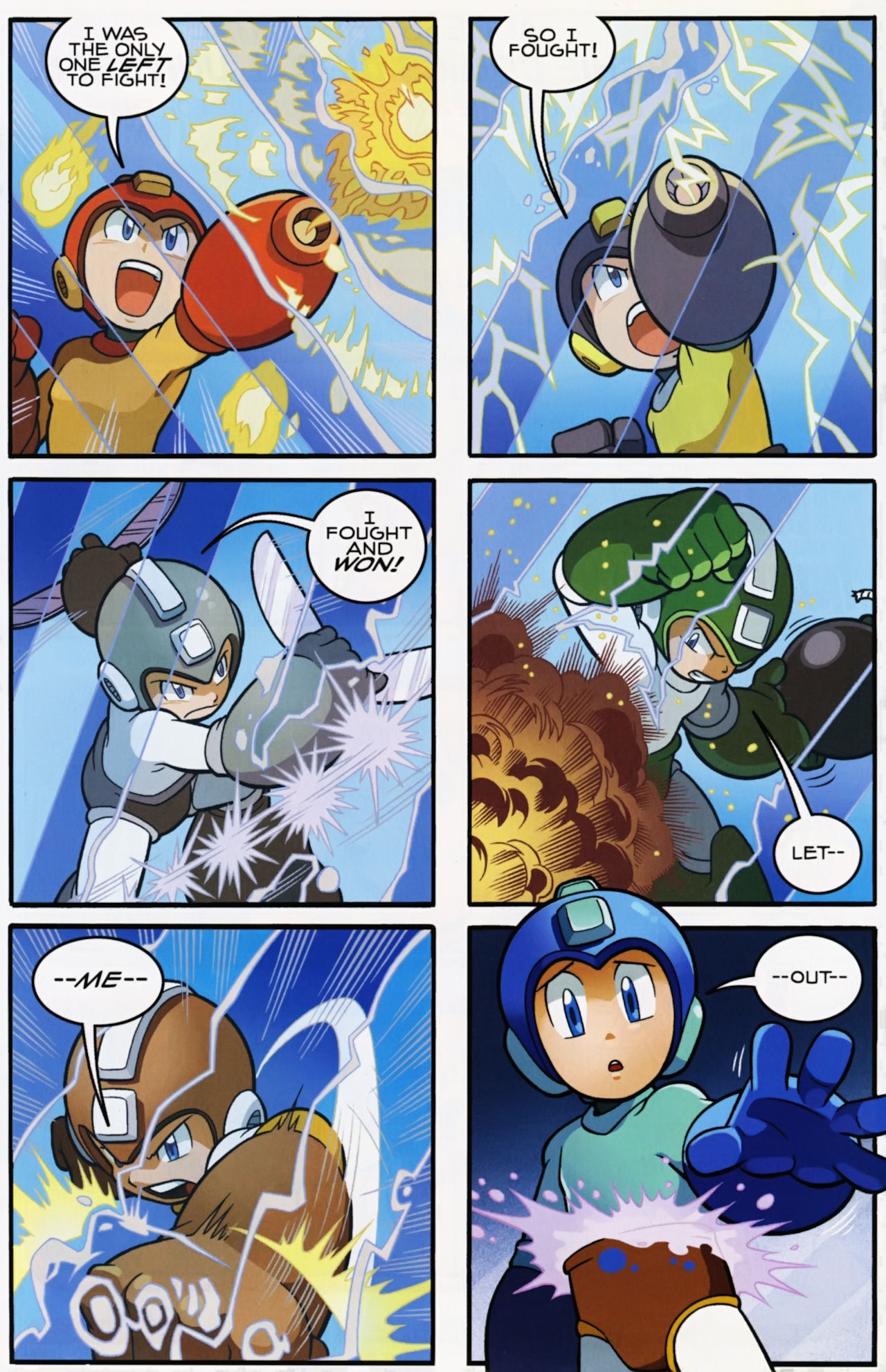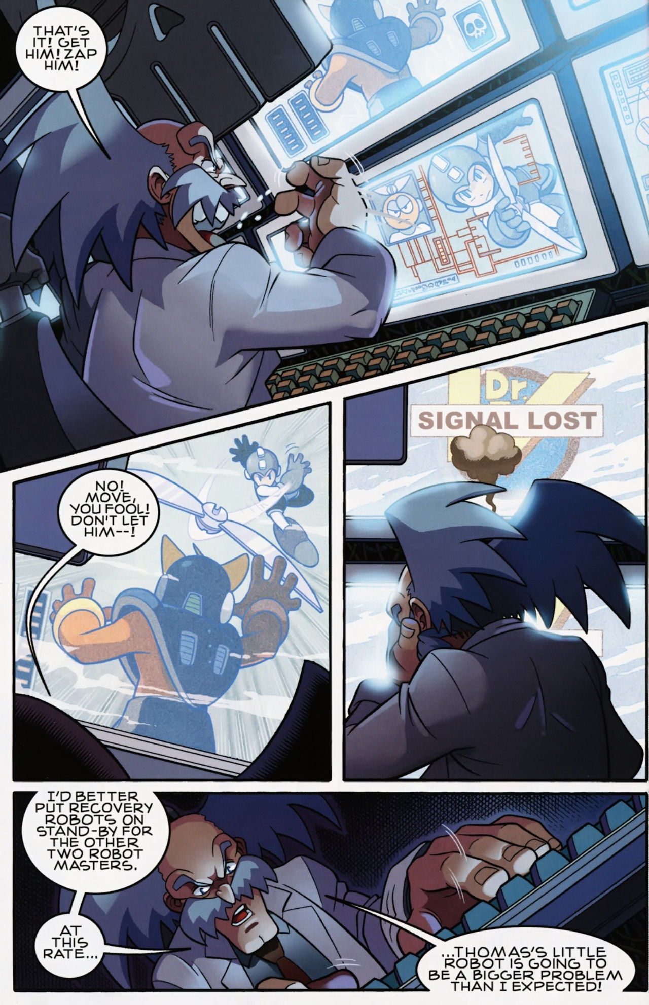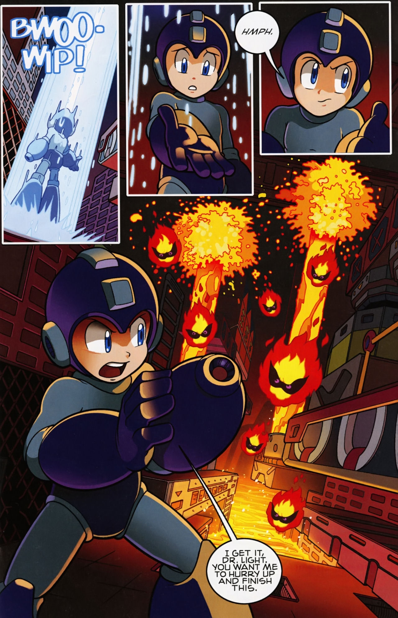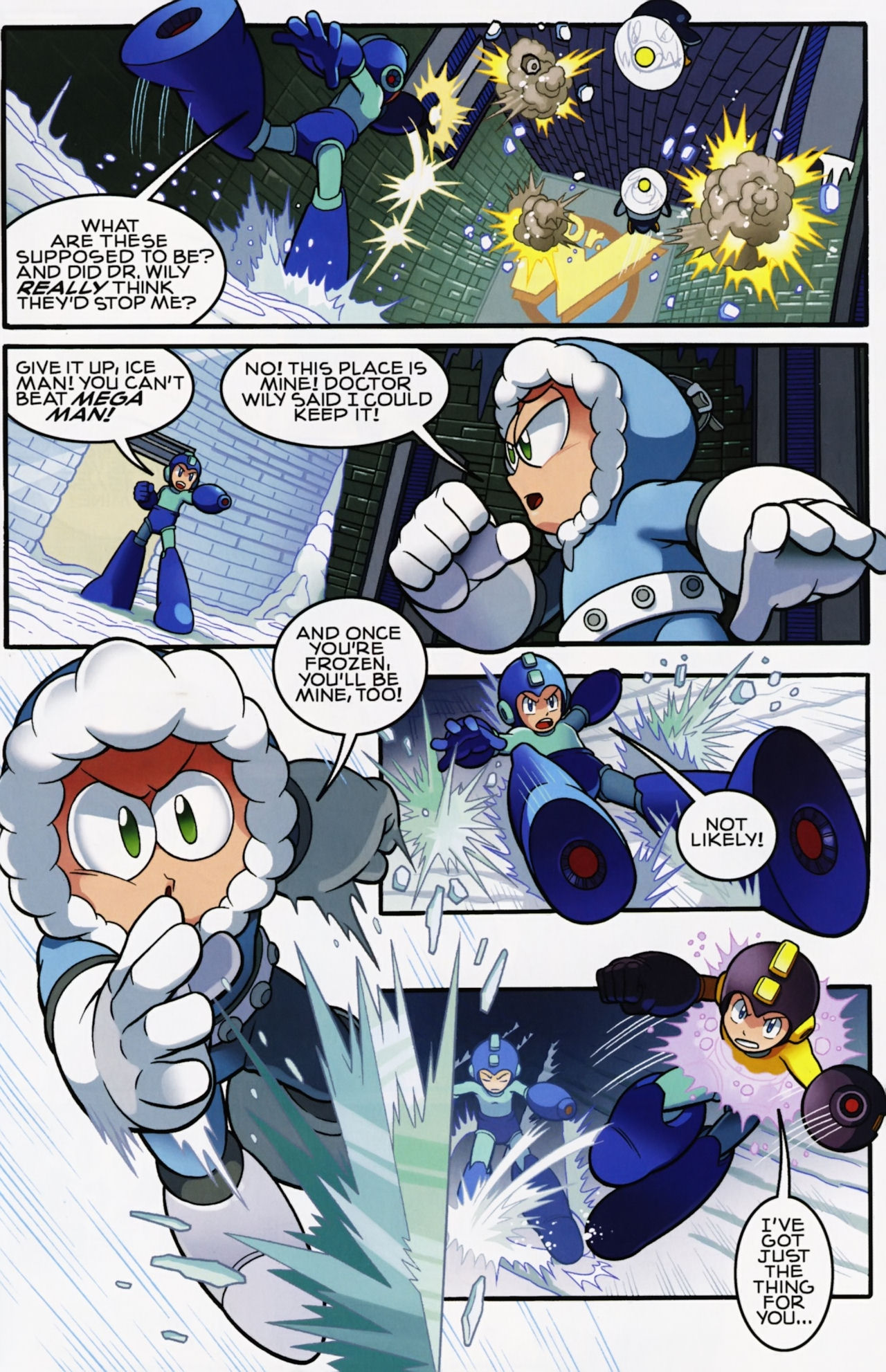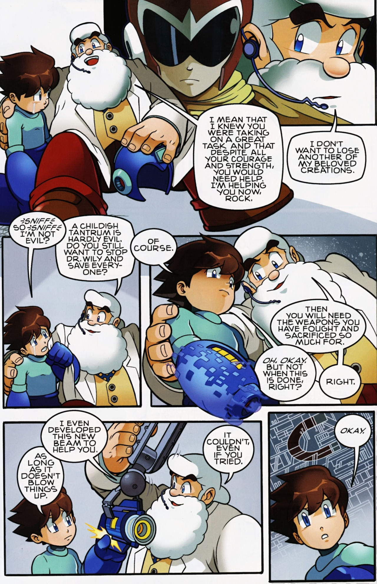 Really don’t like how short the Robot Masters fights are in the Mega Man 1 arc. They not only last about page, but the Robot Masters are also taken out in one hit! Lame! But that said, I do love the scenes between Mega Man and Dr. Light and Roll. And the nods to the Megas are very much appreciated.