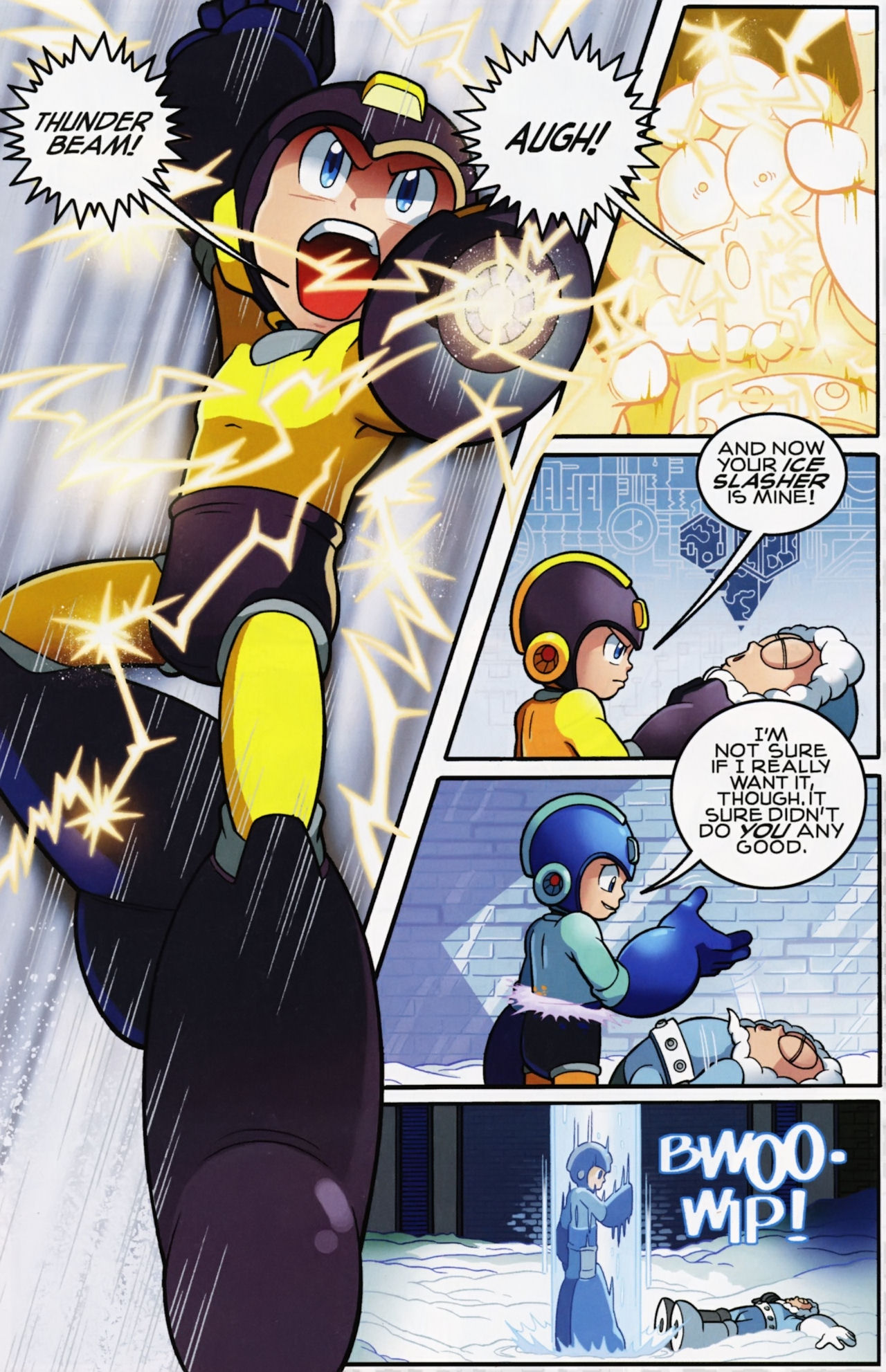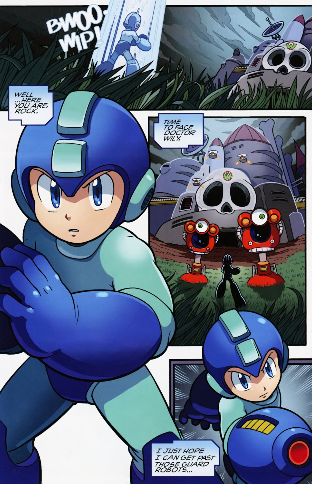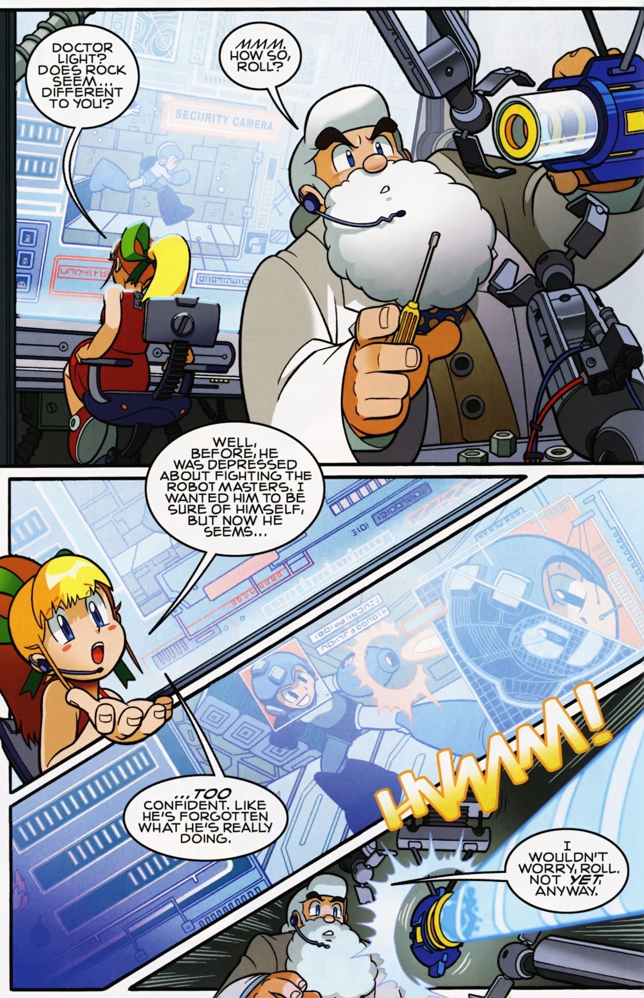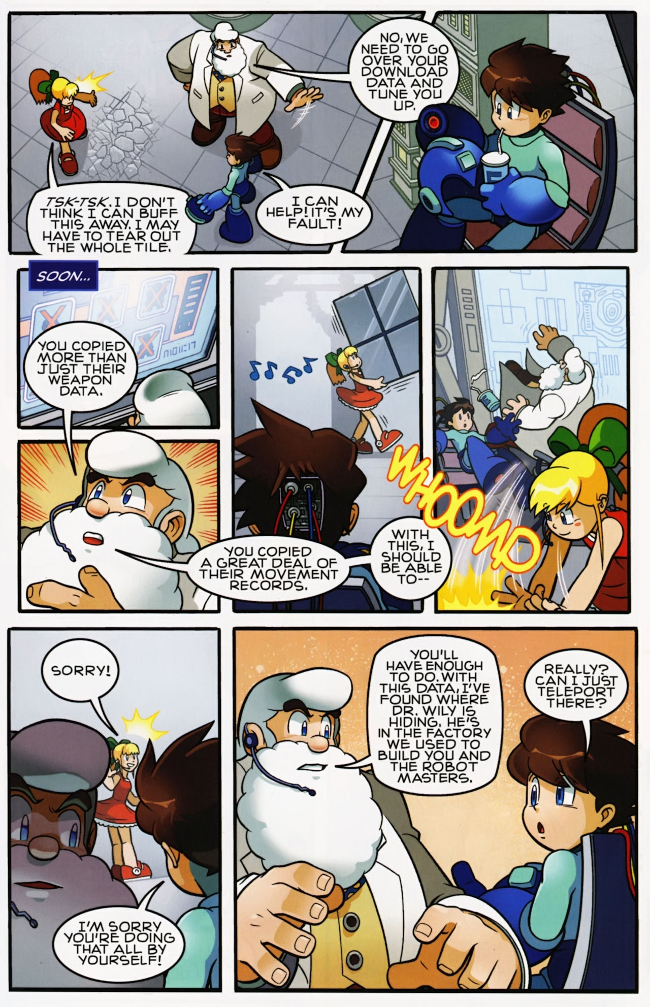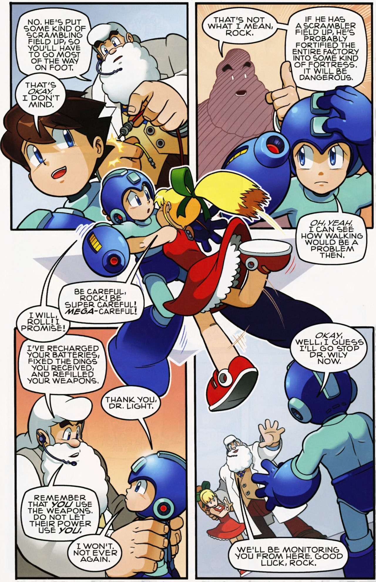 Really don’t like how short the Robot Masters fights are in the Mega Man 1 arc. They not only last about page, but the Robot Masters are also taken out in one hit! Lame! But that said, I do love the scenes between Mega Man and Dr. Light and Roll. And the nods to the Megas are very much appreciated.