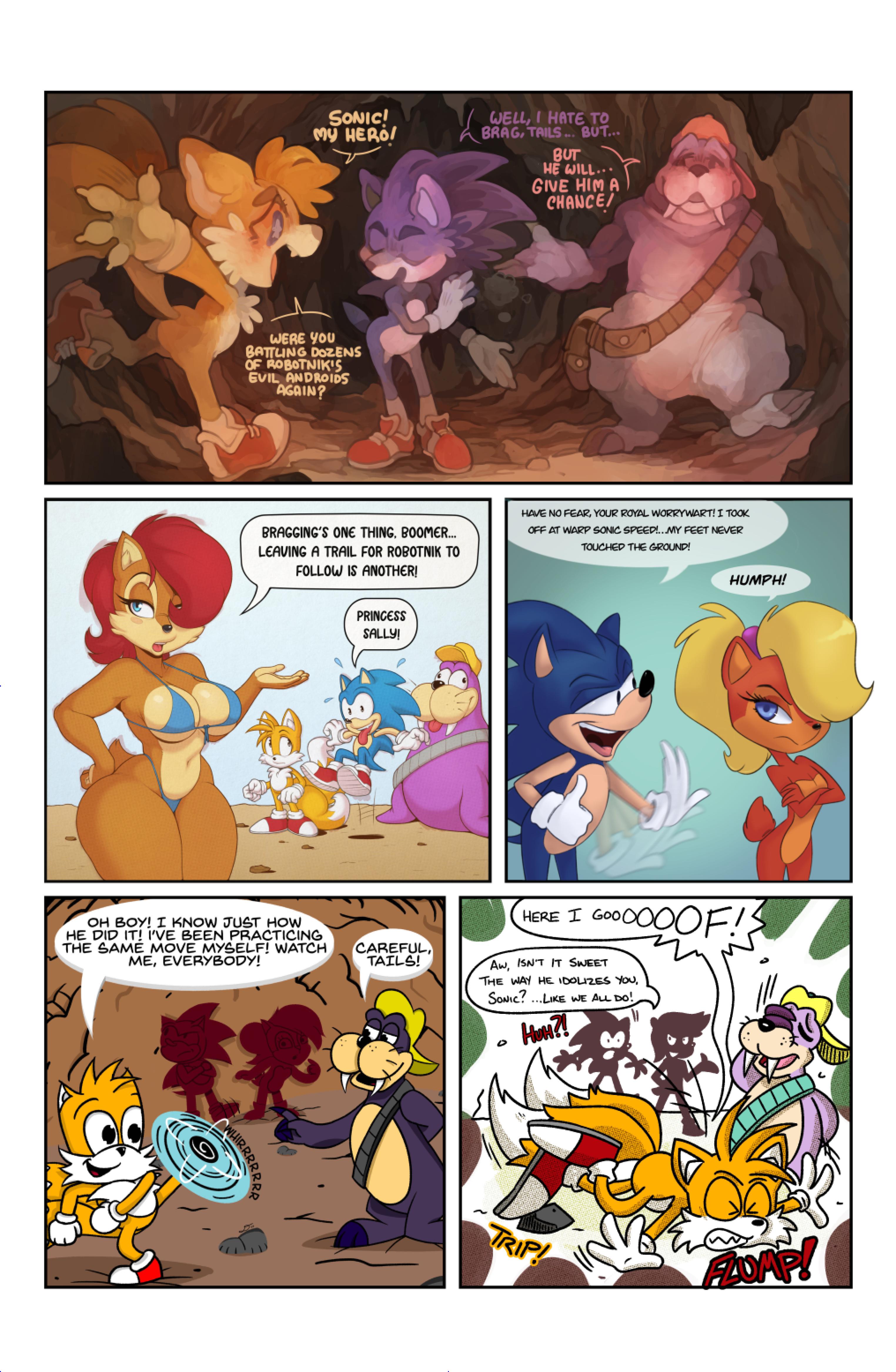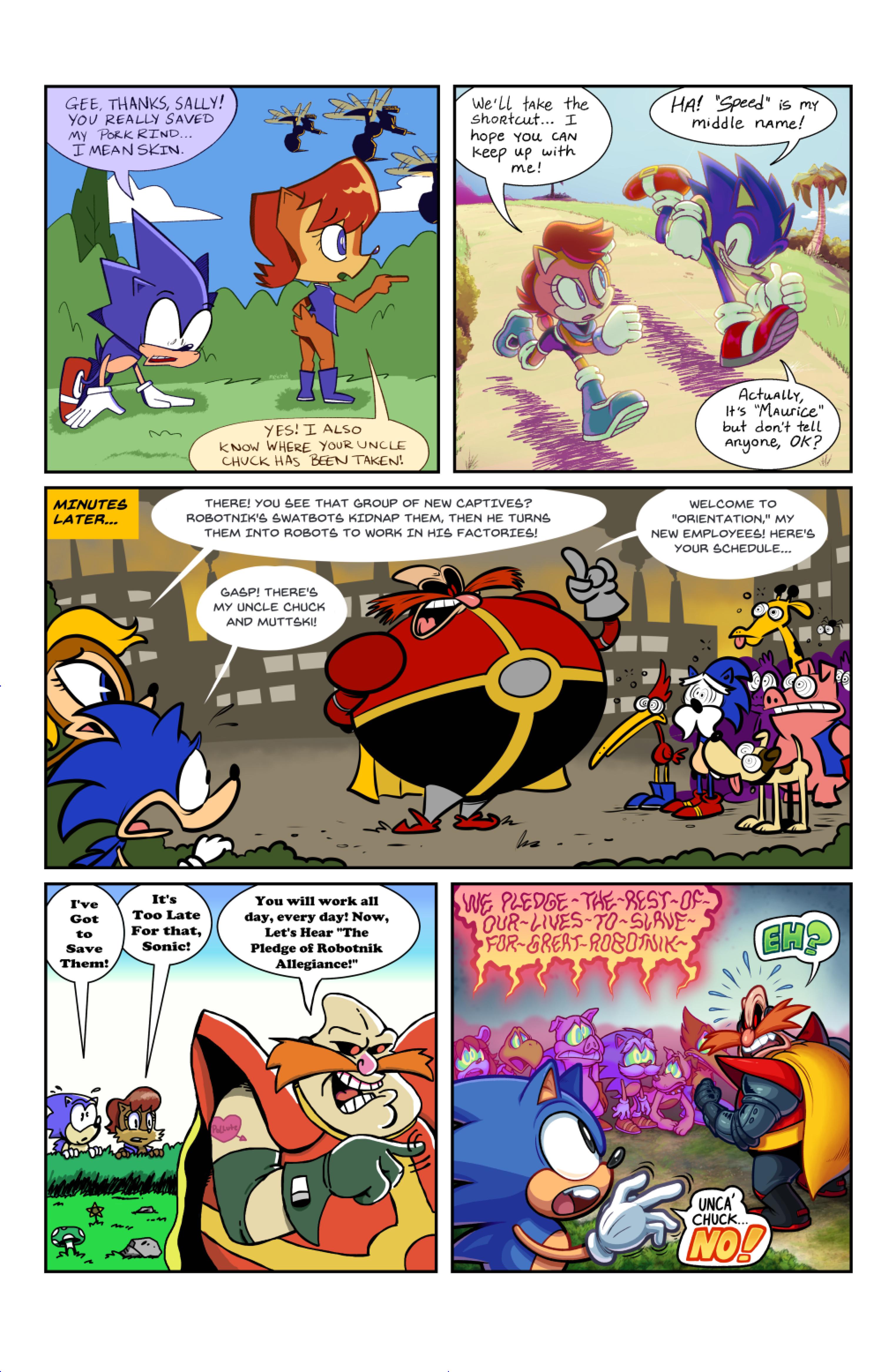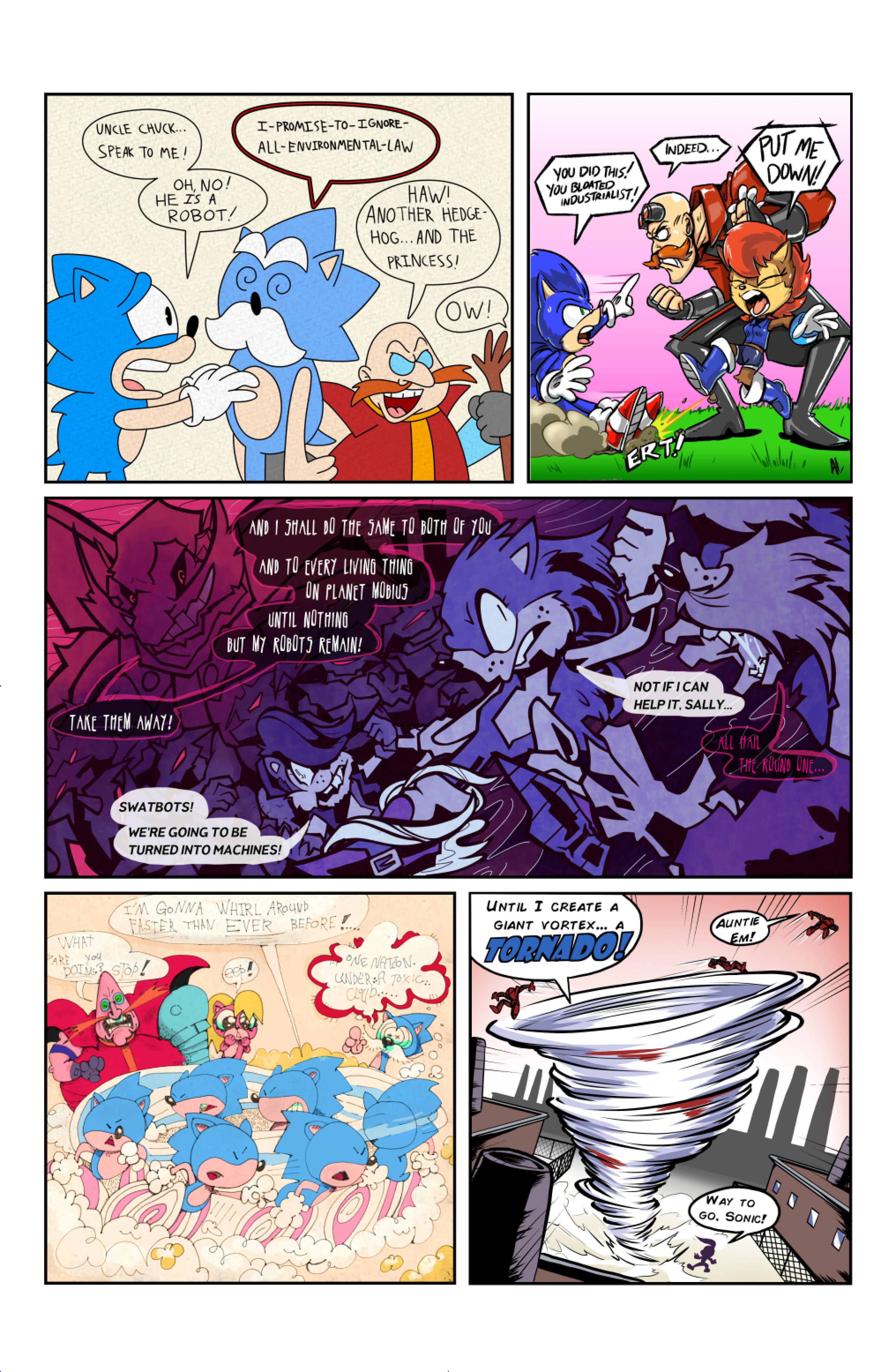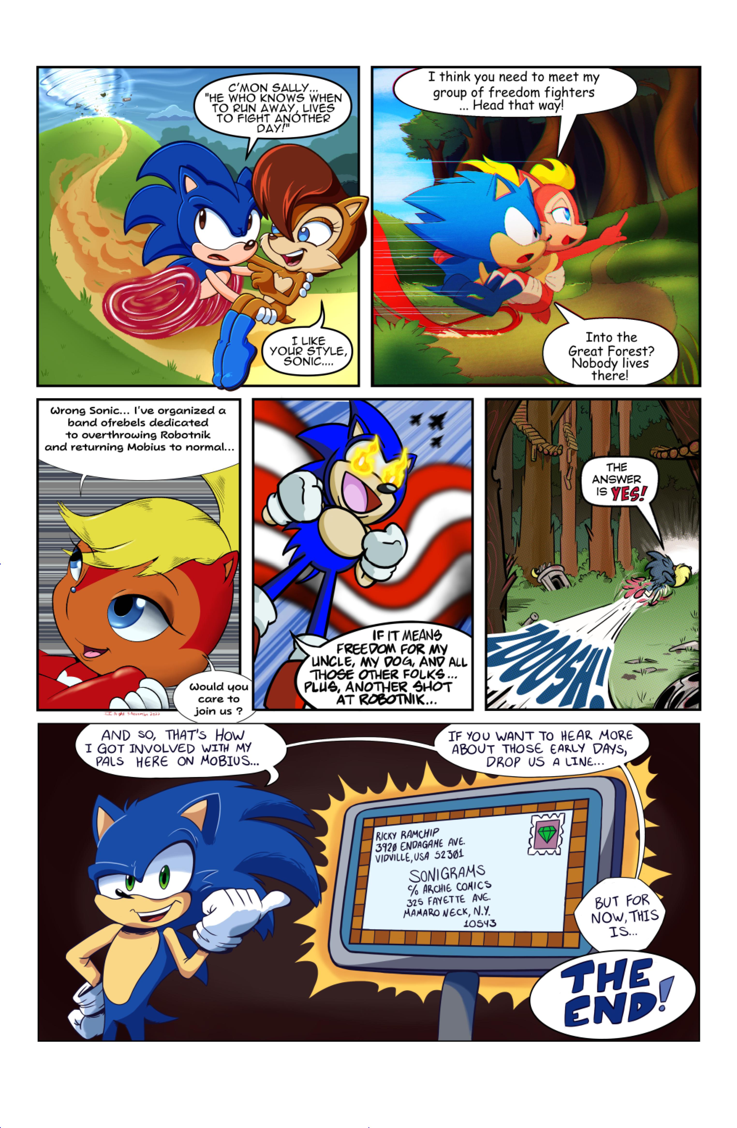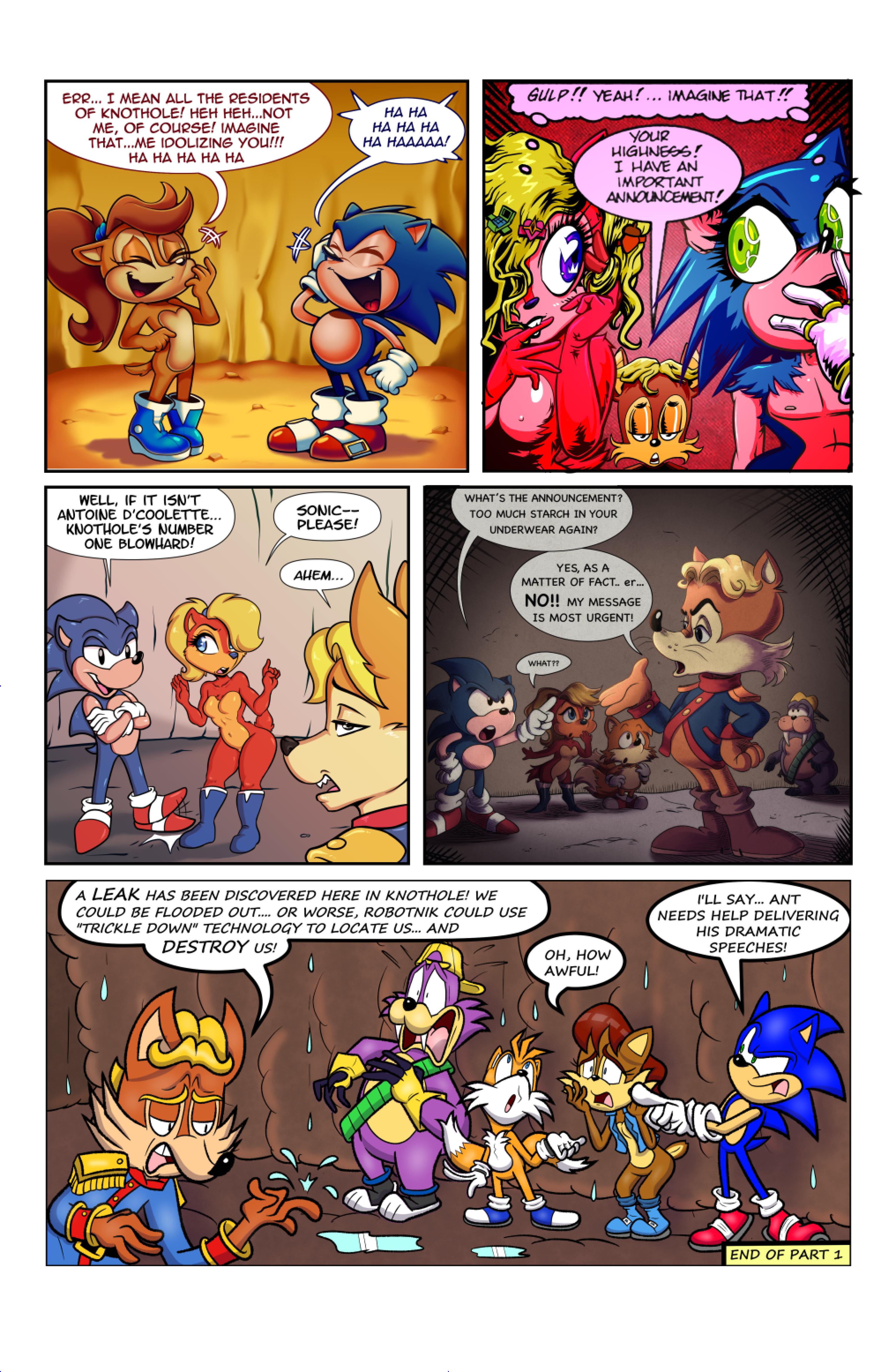 this comic was perfect. first things first the idea like redrawing a comic in different art styles very creative,second some of the art was very cool the way they draw antoine on the character page was very funny, and Sally first appearance who ever drew that you need to go to jail, and the one panel where Antoine interrupt sonic and Sally thinking, why did the person draw Sally and sonic like that it looks creepy.and I can tell some of the art was made by some other sonic fan film/comic makers example the panel where Antoine fell into the pond the art before looked like the tails got trolley art style and the panel where sonic is pulling Antoine out the pond it looks like the same art style of ok ko and in that same page when I saw mii toons art I was so happy and I hope there still working on sonic villains. tbr I never seen or read any of the old comics but this was really funny and the art made it 10x better. really good comic 100/100