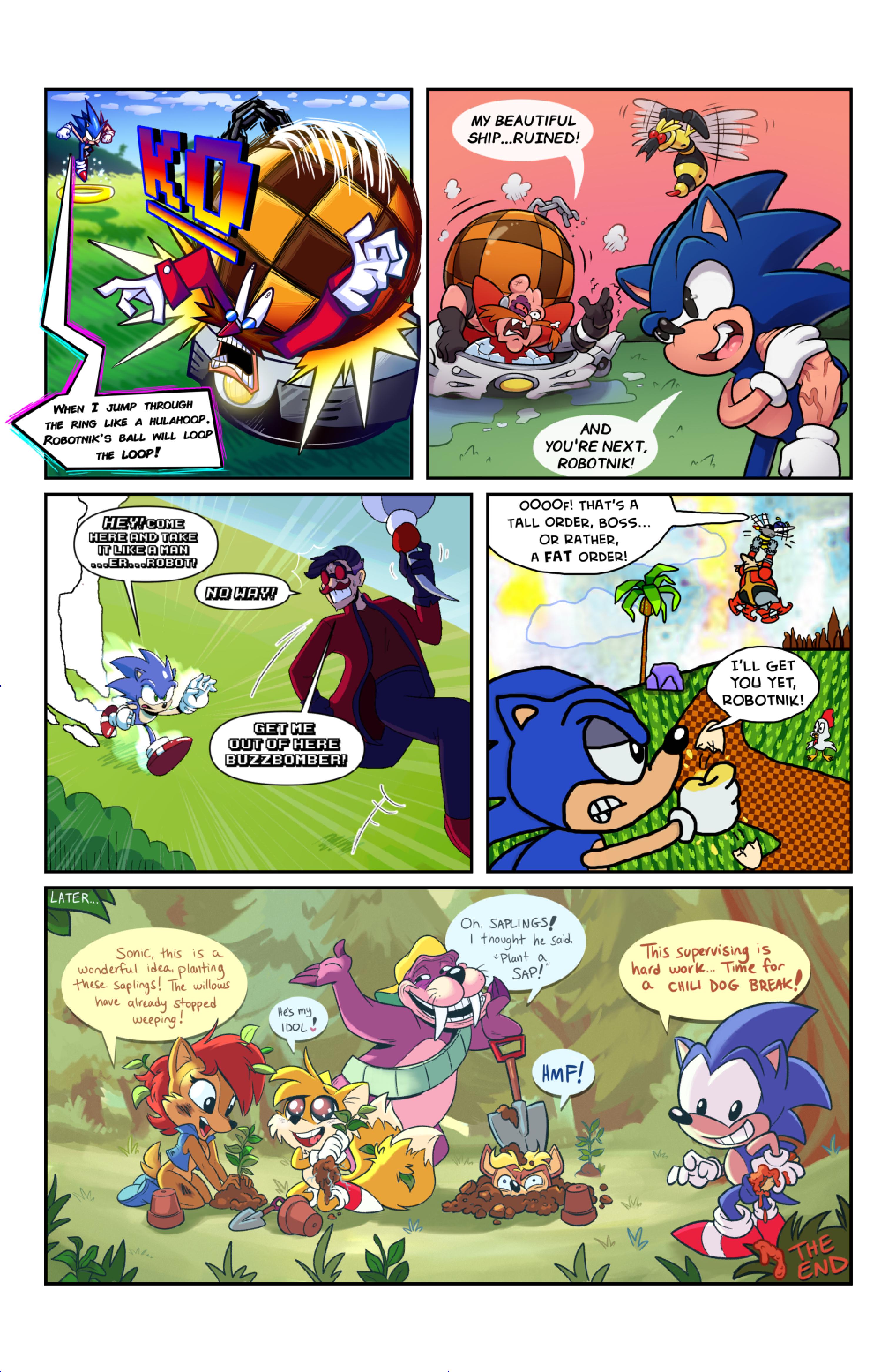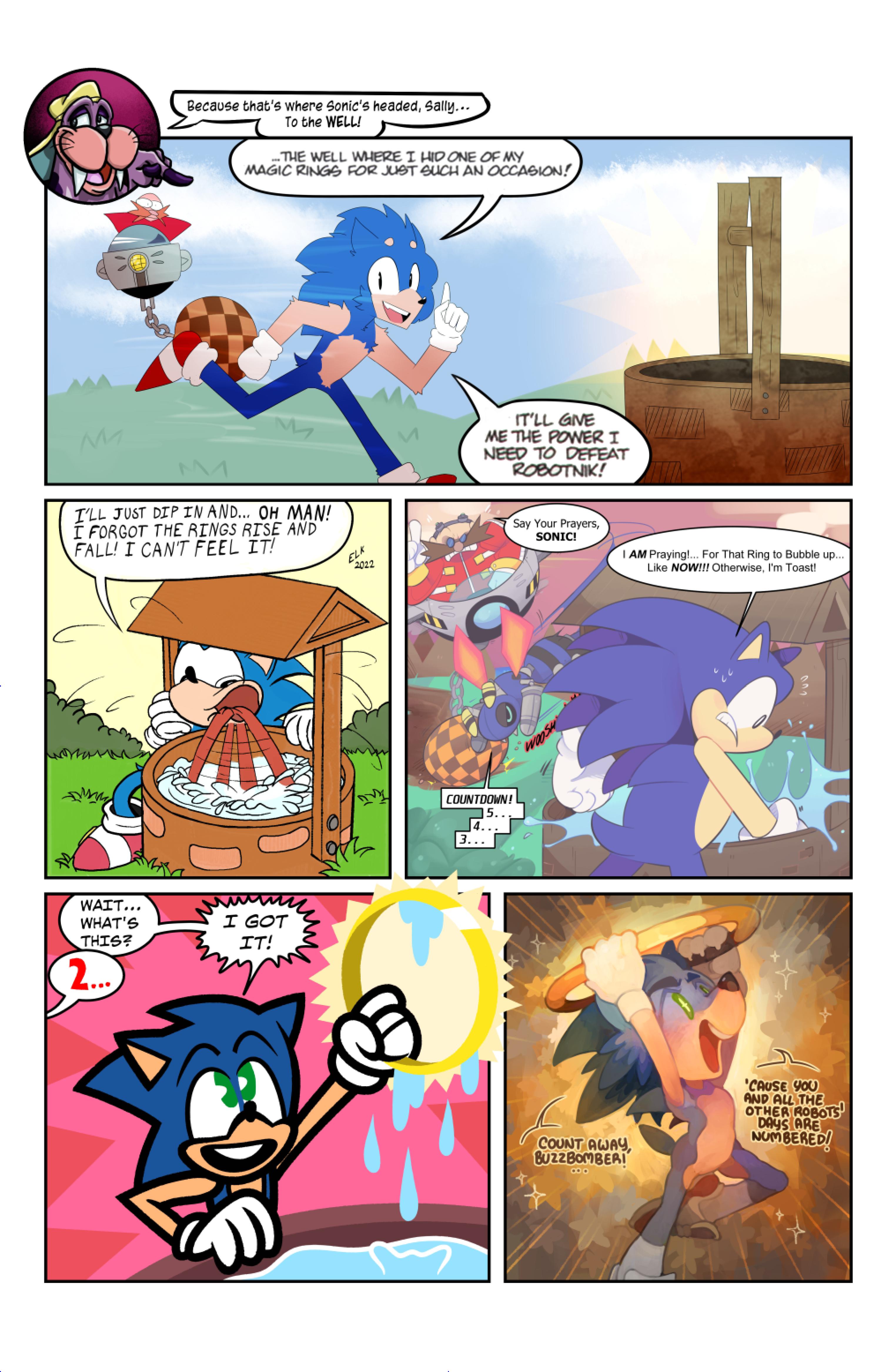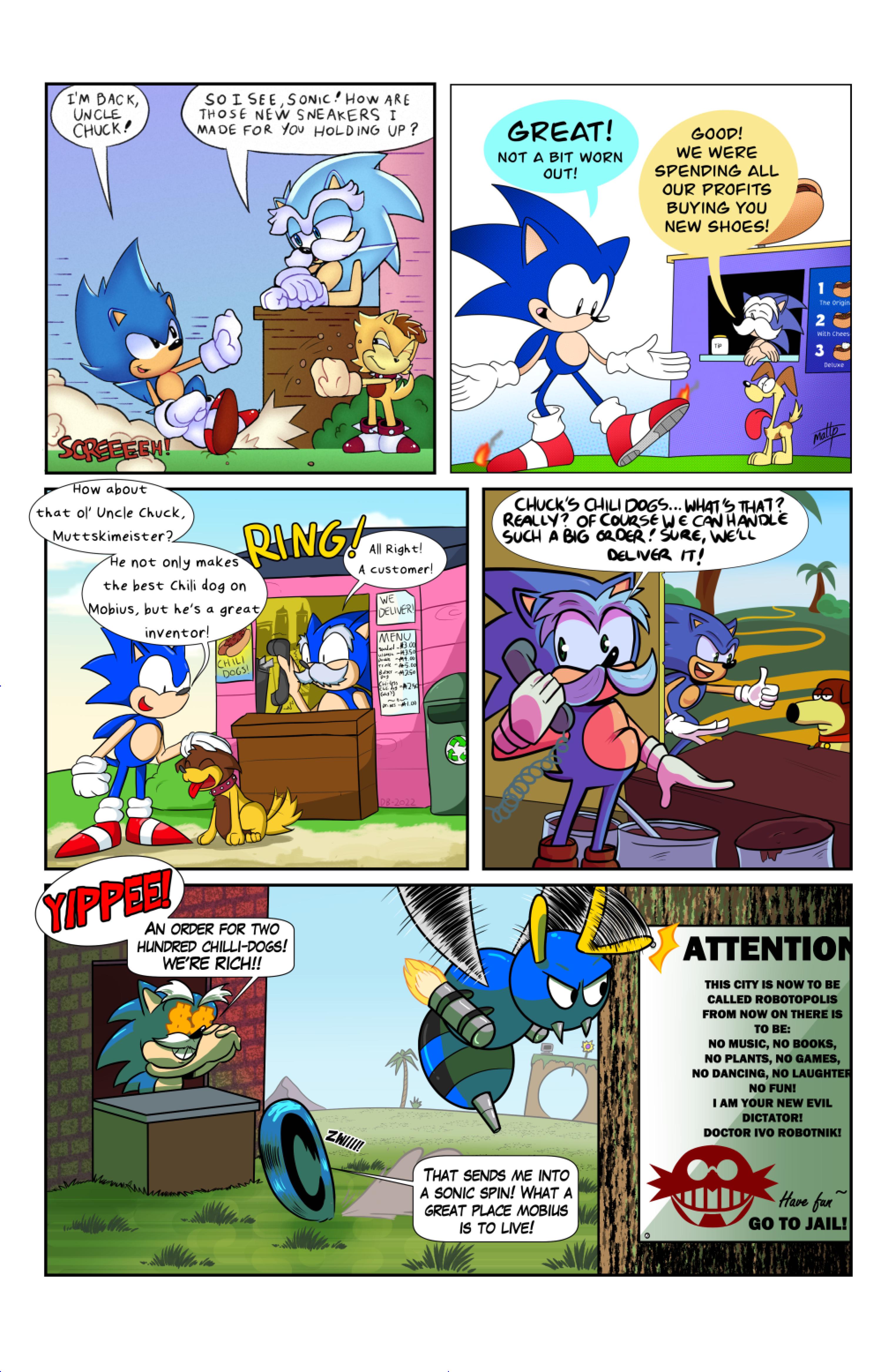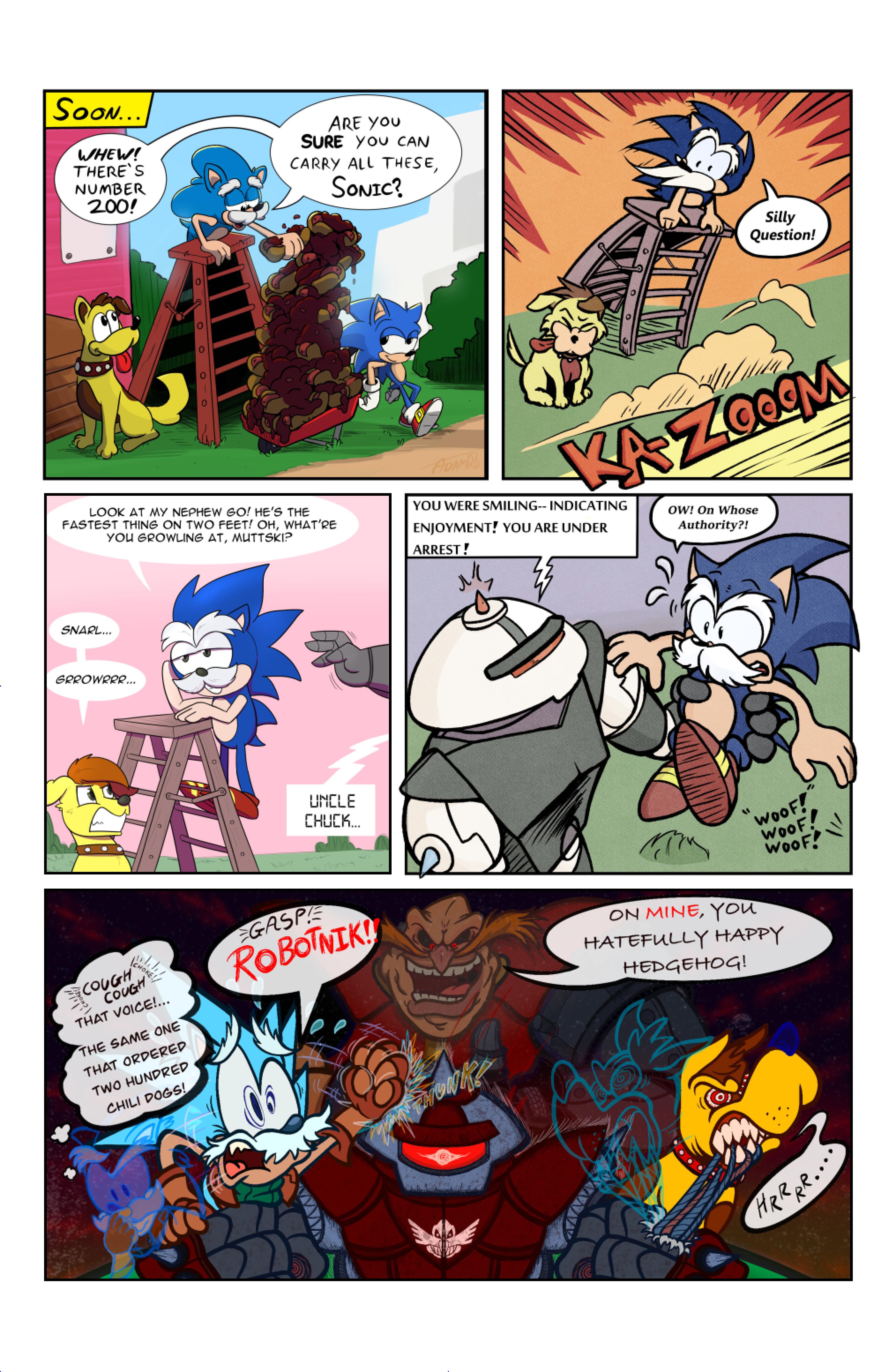 this comic was perfect. first things first the idea like redrawing a comic in different art styles very creative,second some of the art was very cool the way they draw antoine on the character page was very funny, and Sally first appearance who ever drew that you need to go to jail, and the one panel where Antoine interrupt sonic and Sally thinking, why did the person draw Sally and sonic like that it looks creepy.and I can tell some of the art was made by some other sonic fan film/comic makers example the panel where Antoine fell into the pond the art before looked like the tails got trolley art style and the panel where sonic is pulling Antoine out the pond it looks like the same art style of ok ko and in that same page when I saw mii toons art I was so happy and I hope there still working on sonic villains. tbr I never seen or read any of the old comics but this was really funny and the art made it 10x better. really good comic 100/100
