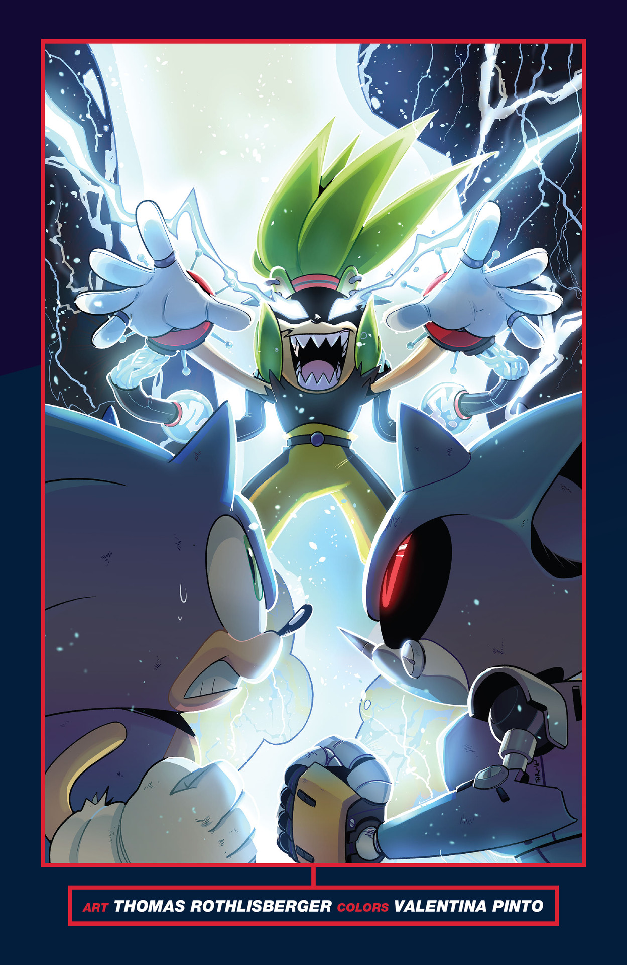 the art by nathalie illustrates what i love about both surge and metal so much, seeing themselves as another side of the same coin compared to sonic, surge believing she’s born to live in his shadow until he is gone, and metal believing he is truly sonic and that what he is doing is the best thing. very compelling characters.