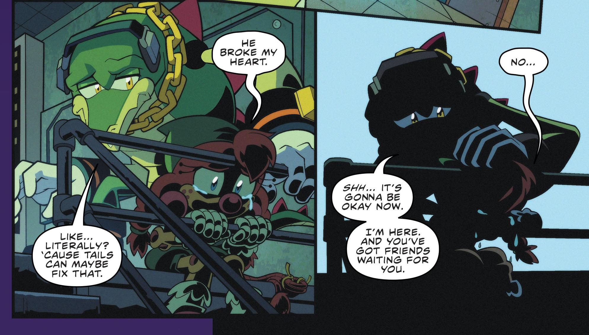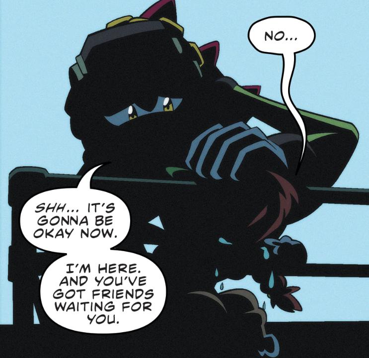 This is one of the main reasons I love the Chaotix. Vector’s like a dad. And this is just too sweet.