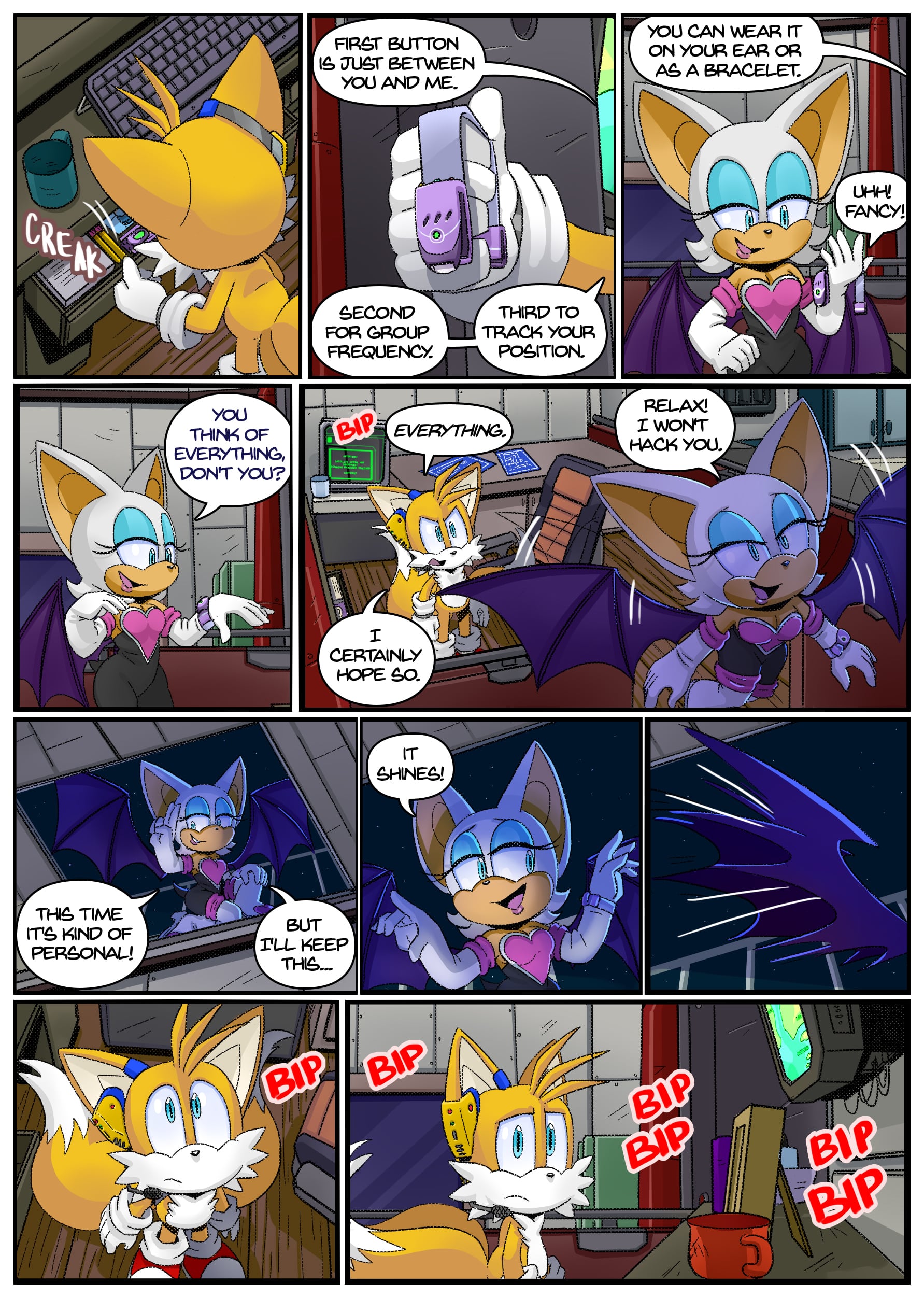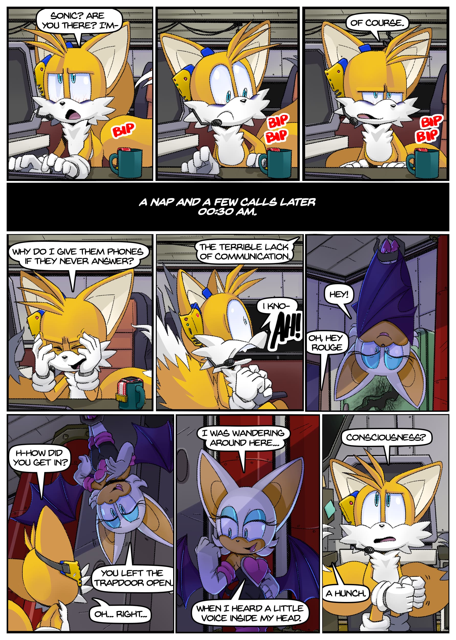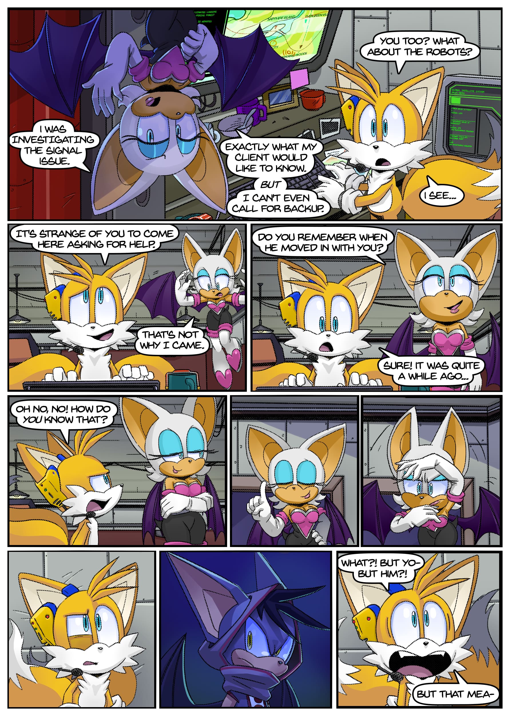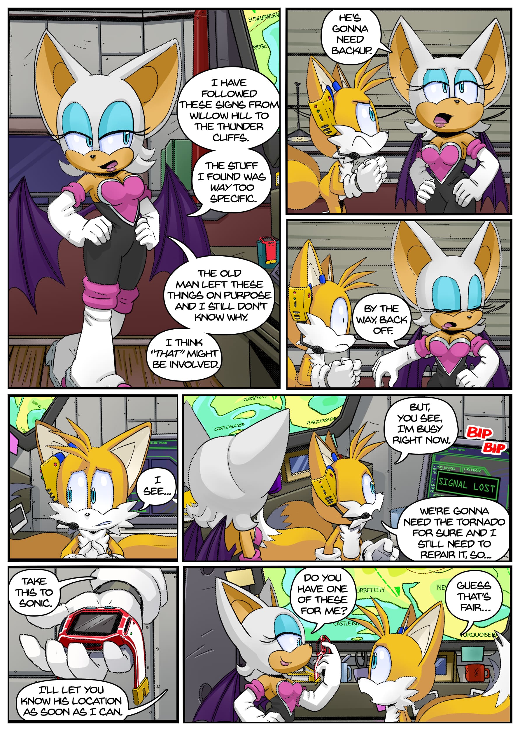 I feel like there was some miscommunication when putting this up because this doesn’t seem to be an origin story for anything, the characters not only know each other already but have been doing this for years. And Either some panels from chapter 2 found their way to chapter 1 or the unclear setting is distracting me from whatever explanation there is for why Rouge is in Tails’ lab in chapter 1 but he acts surprised when she shows up there in chapter 2.