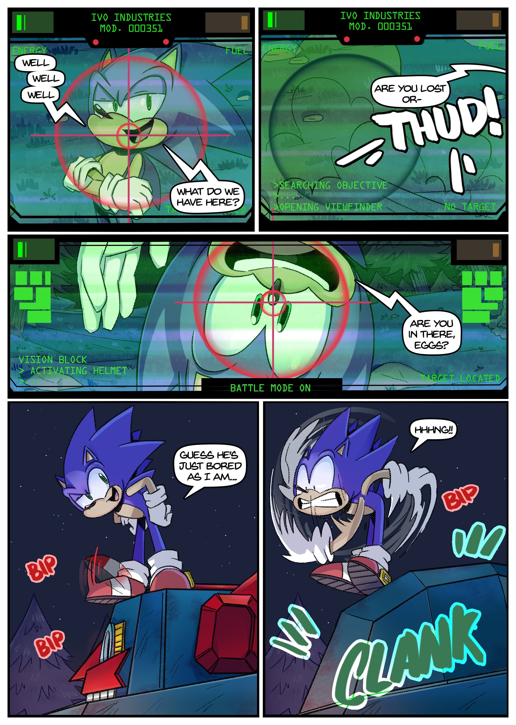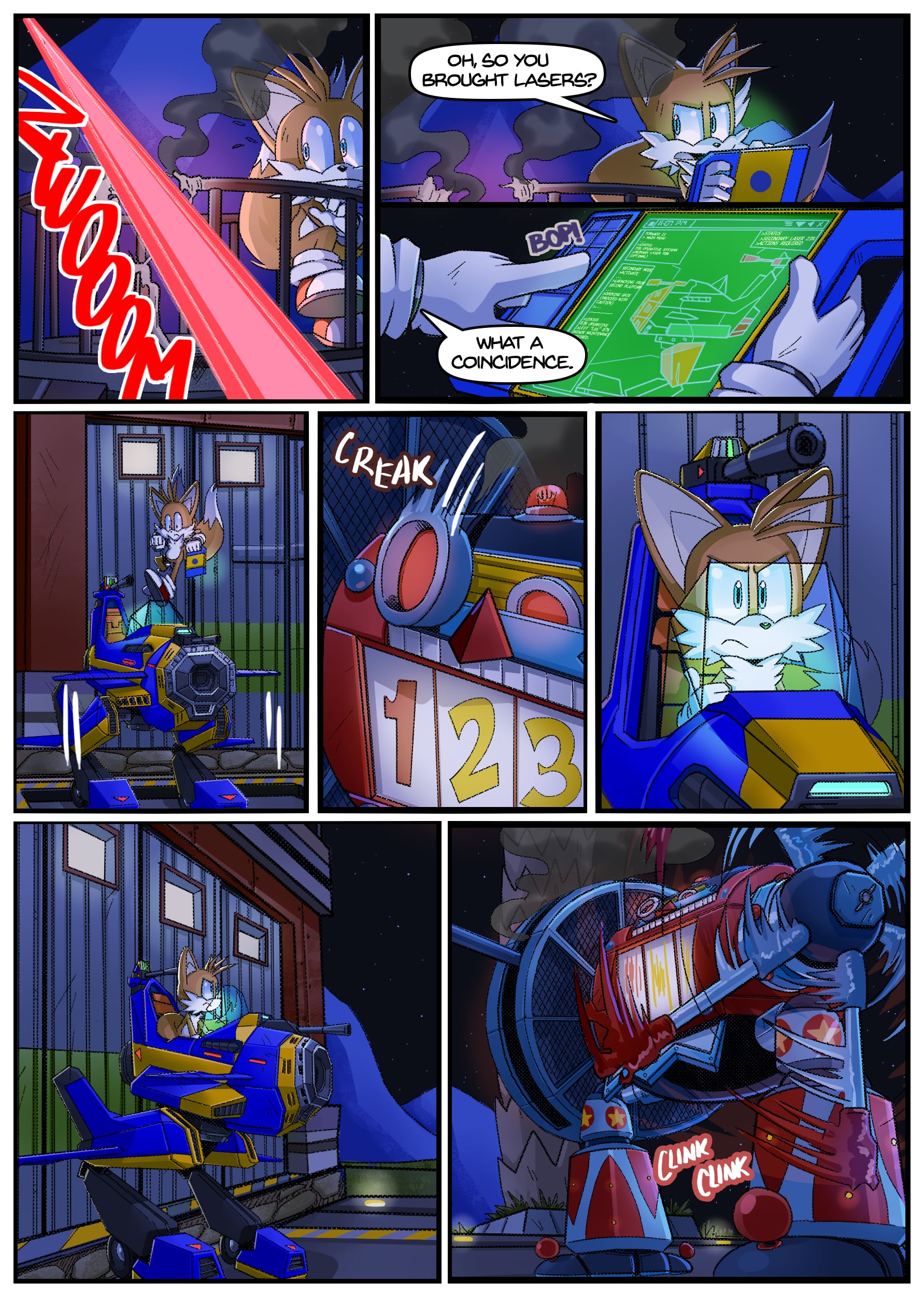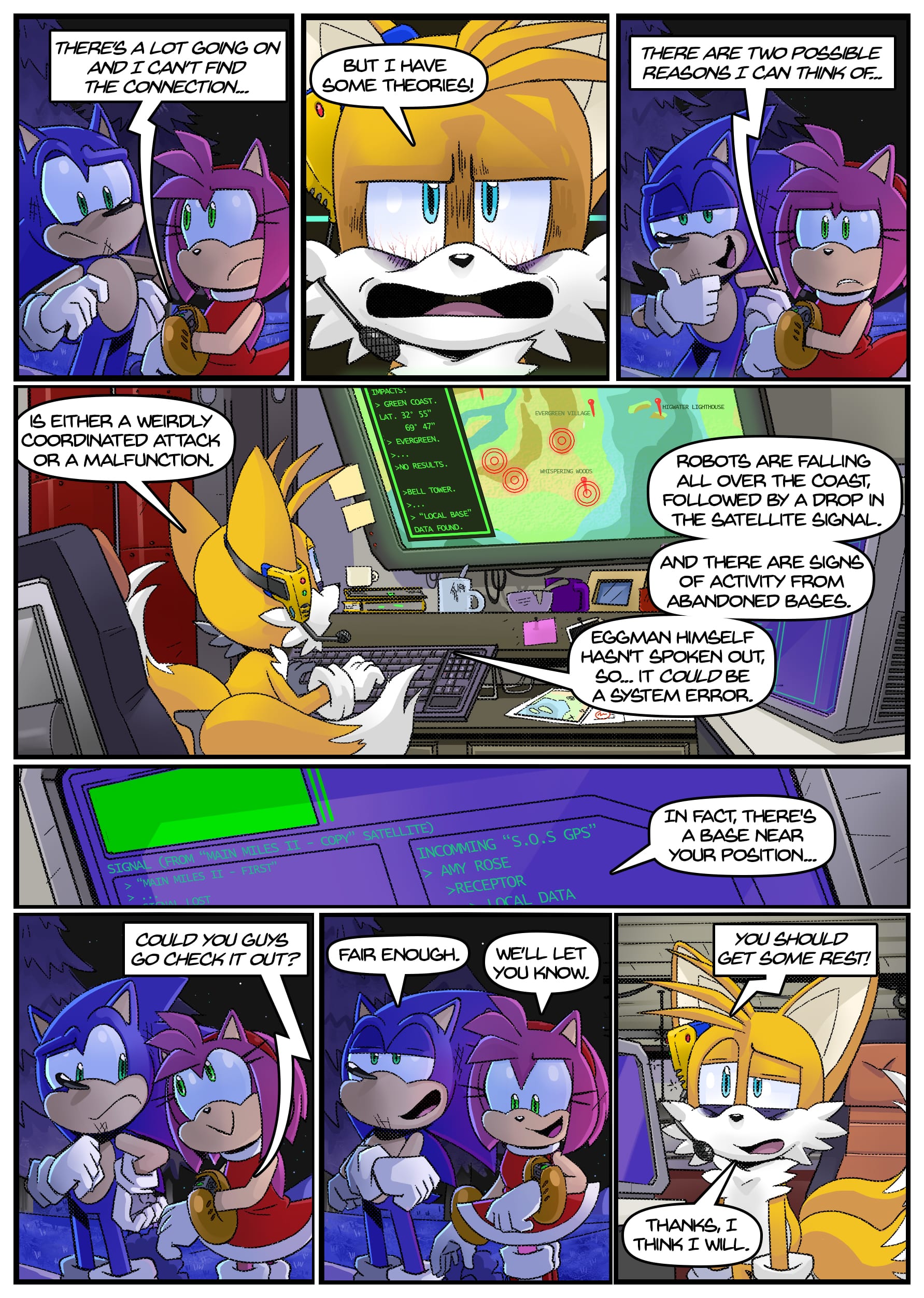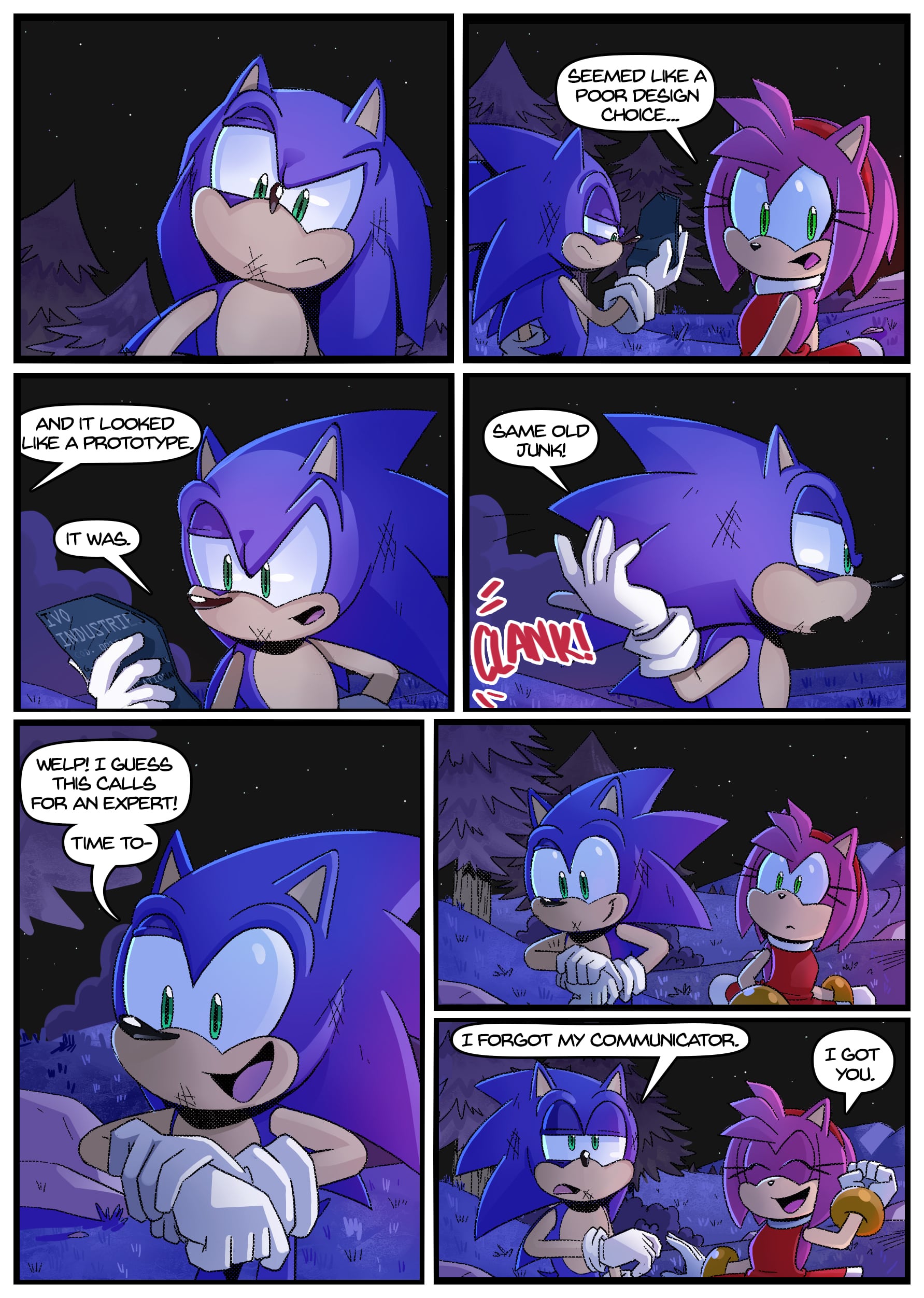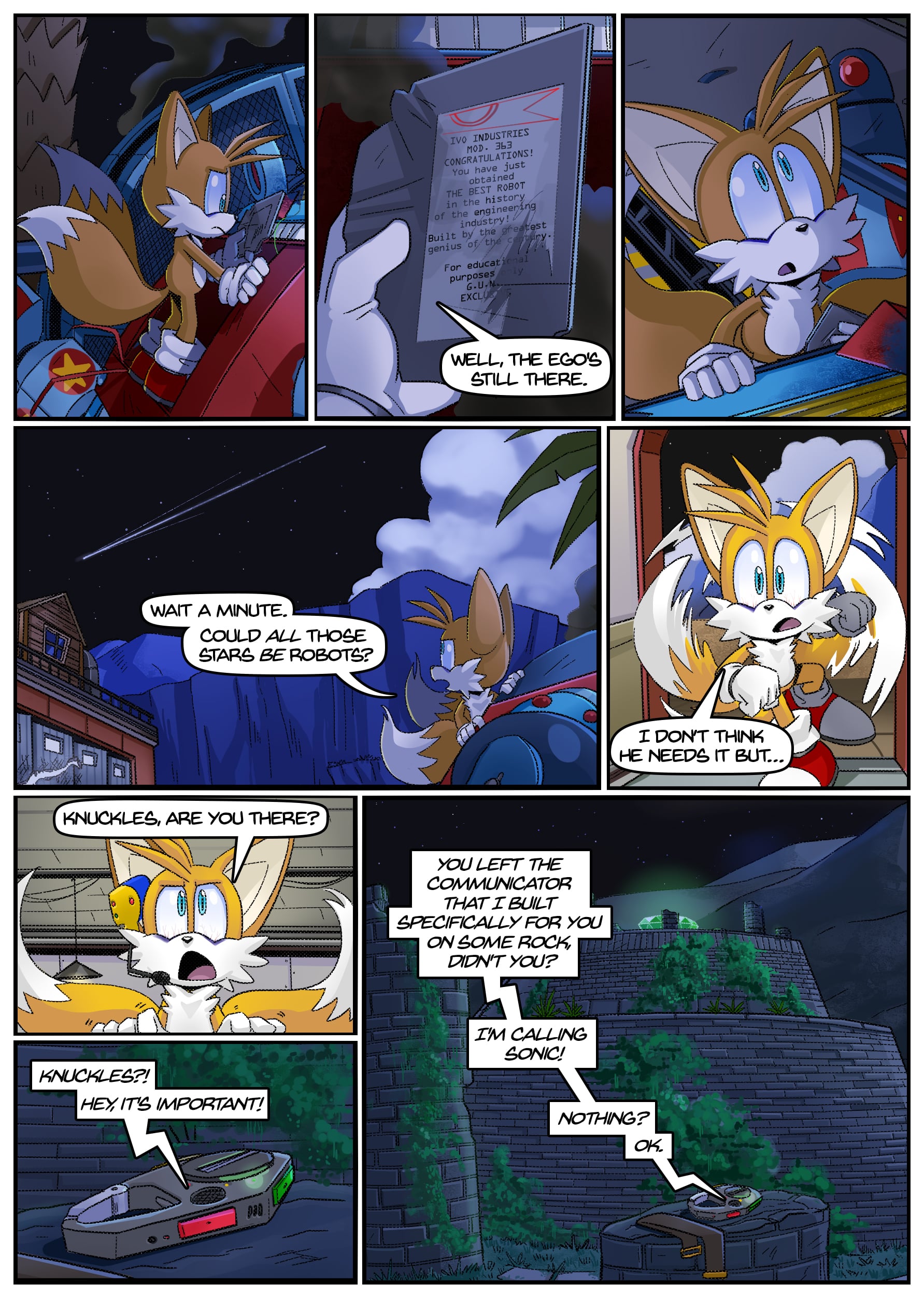 I feel like there was some miscommunication when putting this up because this doesn’t seem to be an origin story for anything, the characters not only know each other already but have been doing this for years. And Either some panels from chapter 2 found their way to chapter 1 or the unclear setting is distracting me from whatever explanation there is for why Rouge is in Tails’ lab in chapter 1 but he acts surprised when she shows up there in chapter 2.