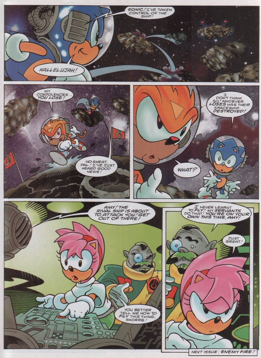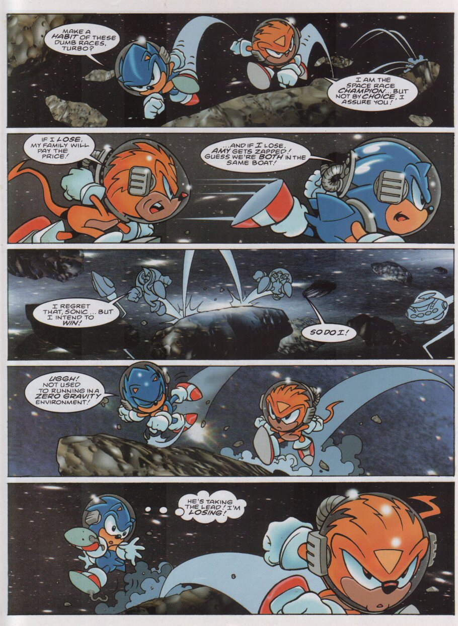This may have been a printing error, but I think Turbo was going to say that the loser’s spaceship was going to be destroyed and Sonic saying “What?,” it surprise.