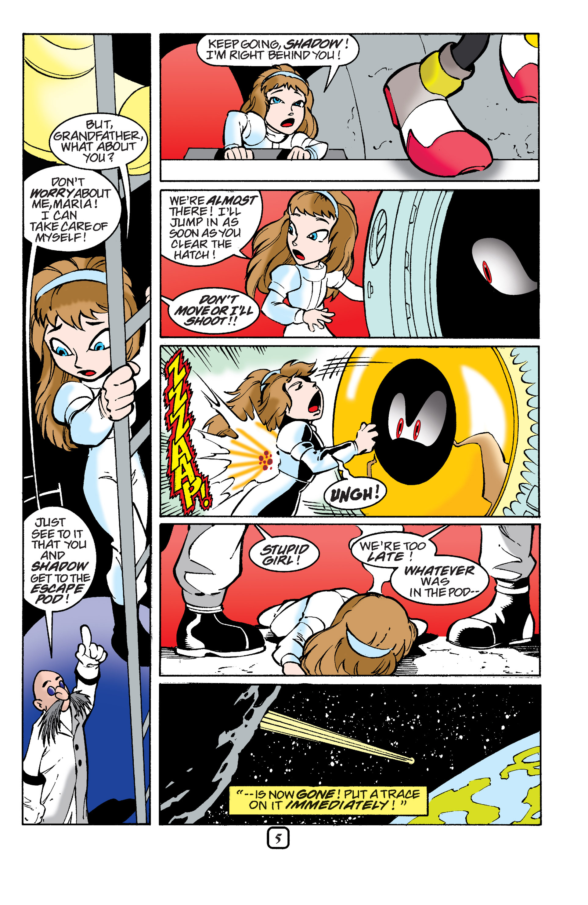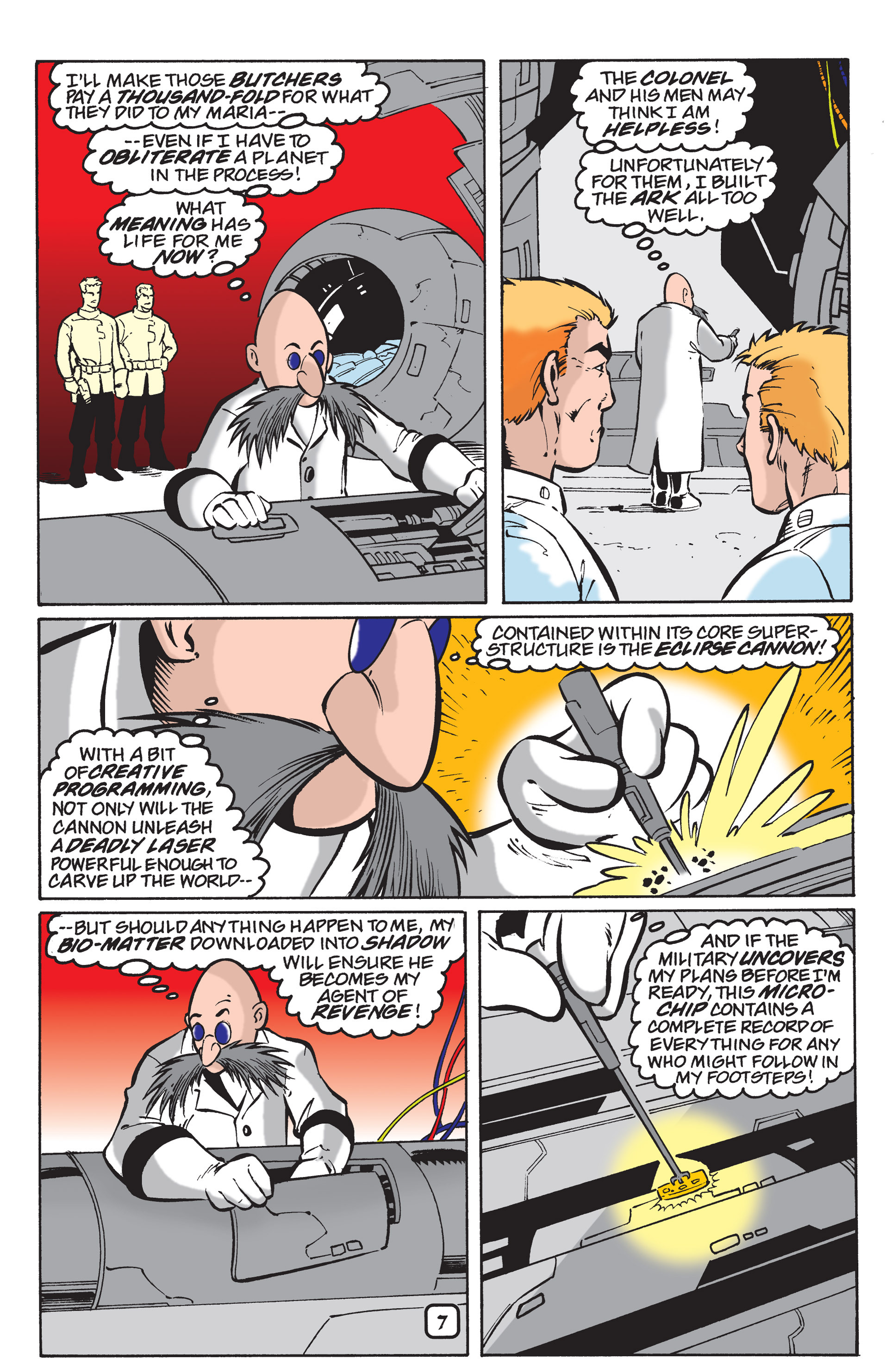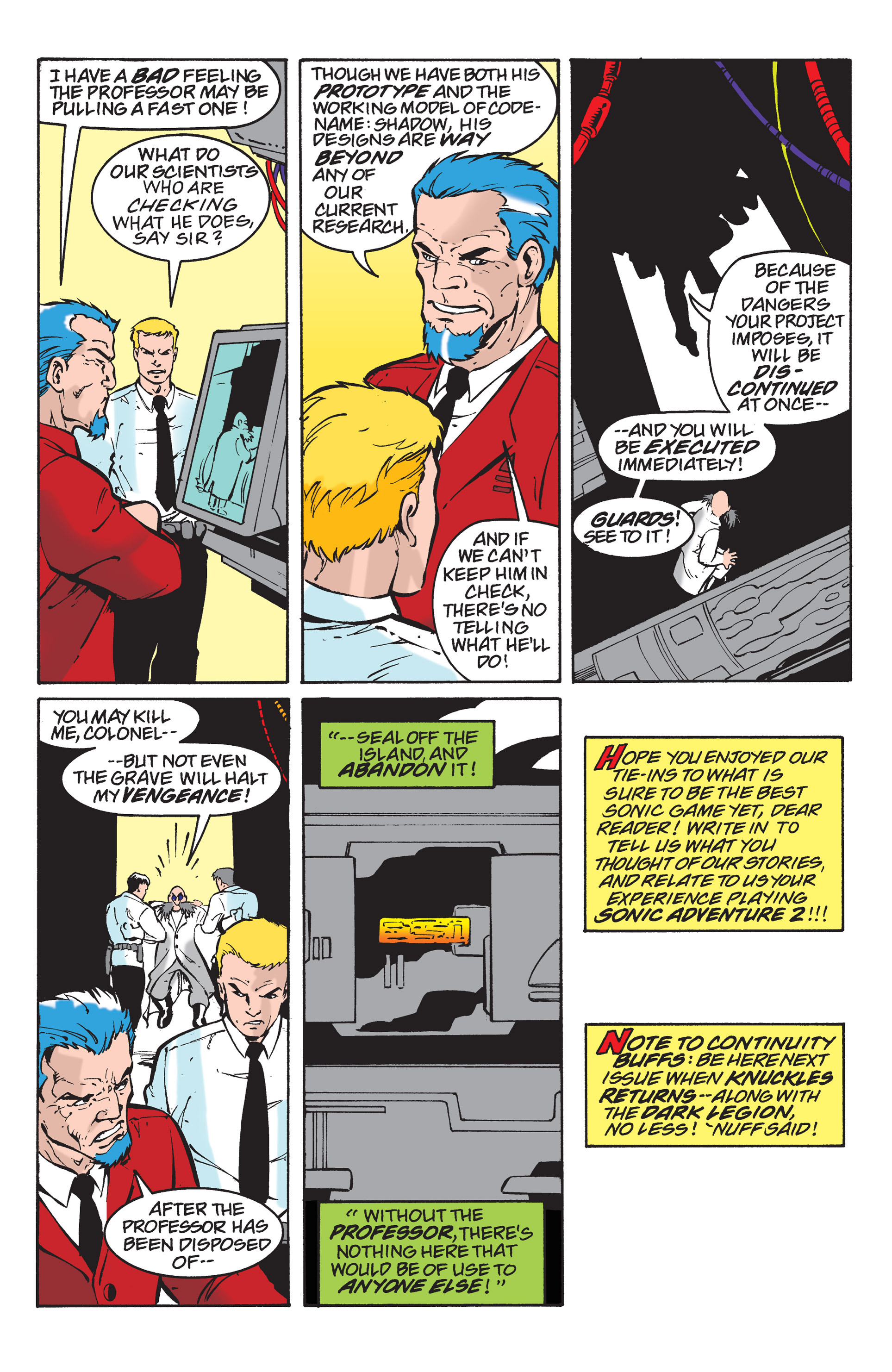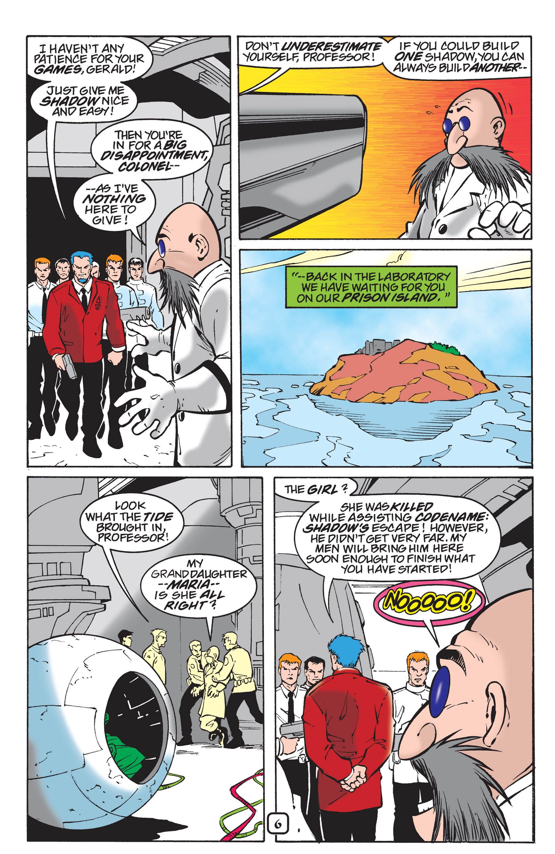 Haha! Sorry, Silver Sonic, but Shadow is way cooler than you! See, President, this is why you need colored newspapers! Awesome adaptation of the City Escape level! AND HERE COMES THE TRUCK! So, Hedgehog species are the universal constant. Dur hur, Gerald’s a pinhead. Lol Maria didn’t have a chance to bond with Shadow before she died. ^^;