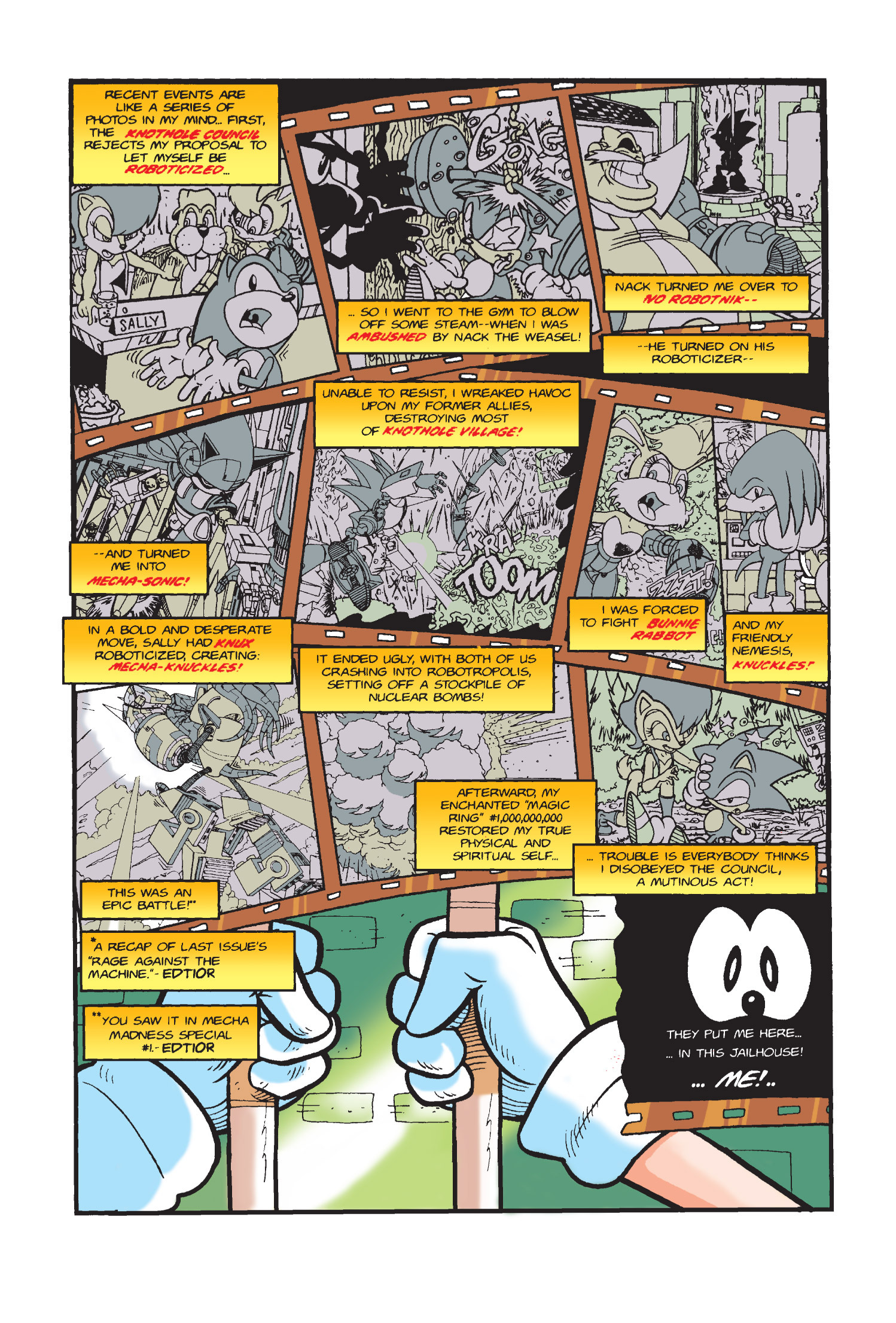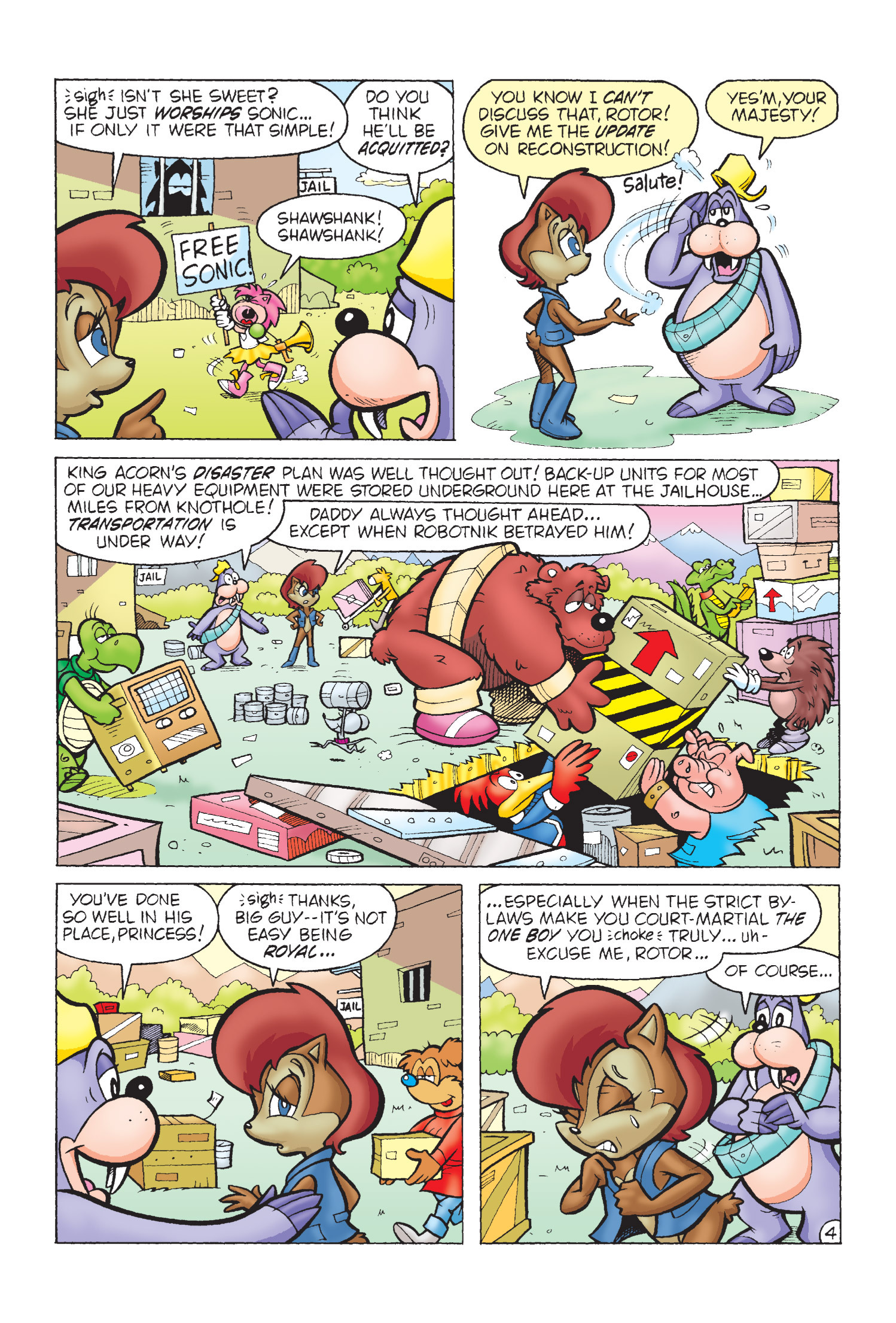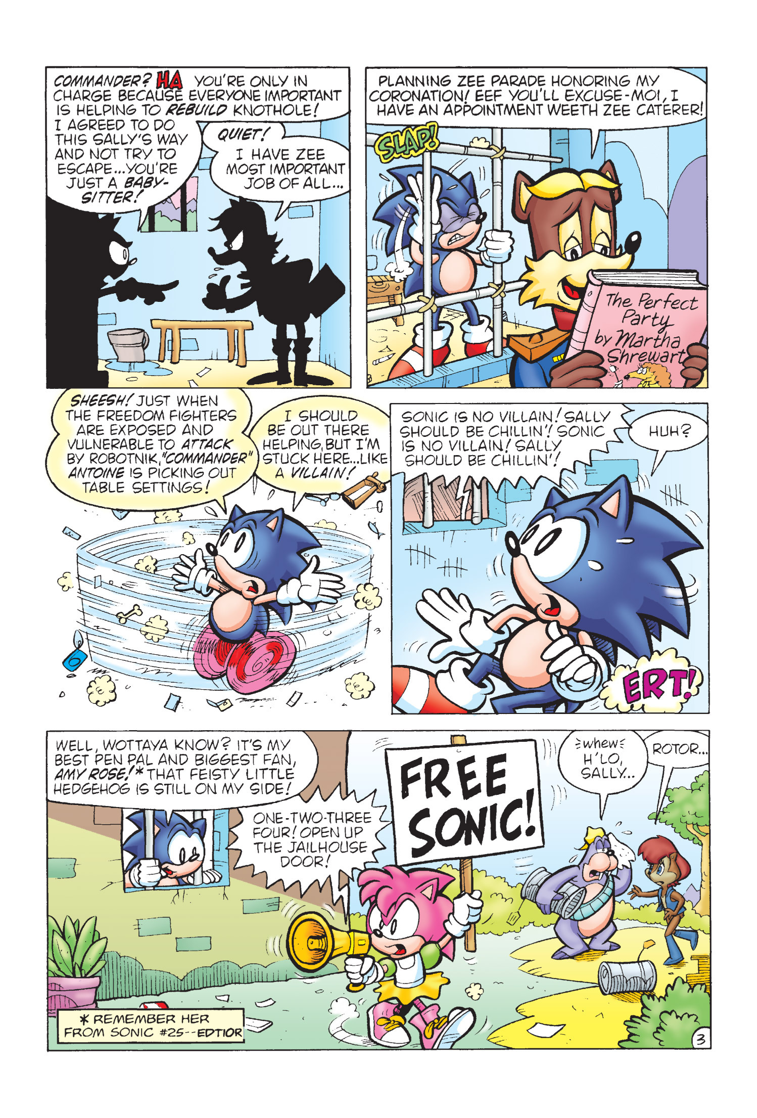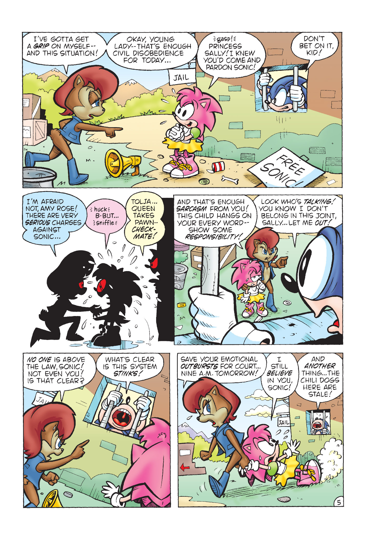 Funny how Amy is protesting for Sonic’s freedom here but fast forward to Sonic Adventure 2 she takes action and completely bails him out. (I know there is no correlation between the comics and games but who knows maybe the game gets inspiration from here.)
