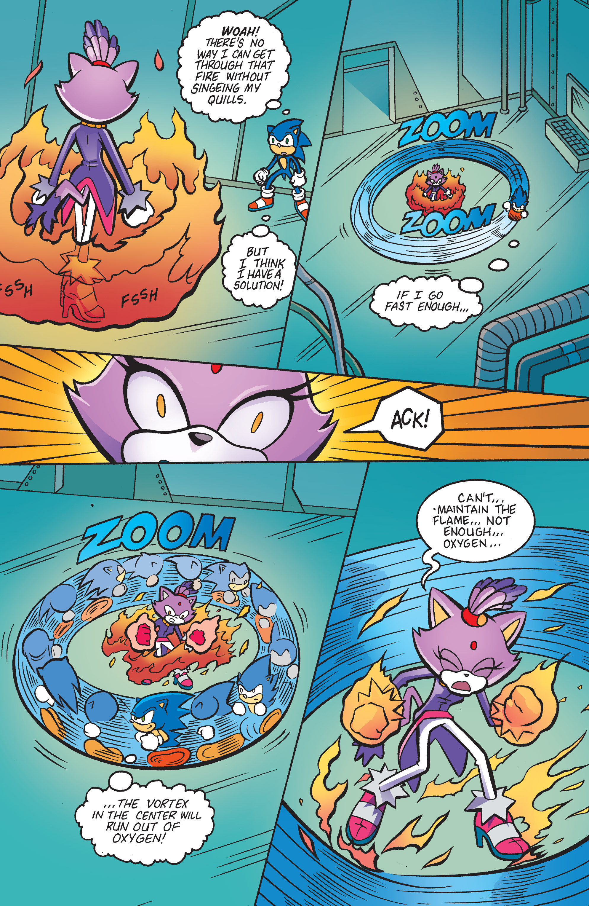 Oh boy, Finitevus is back. He’s so cool looking! That’s a clever technique for Sonic, lowing the oxygen inside his cyclone!