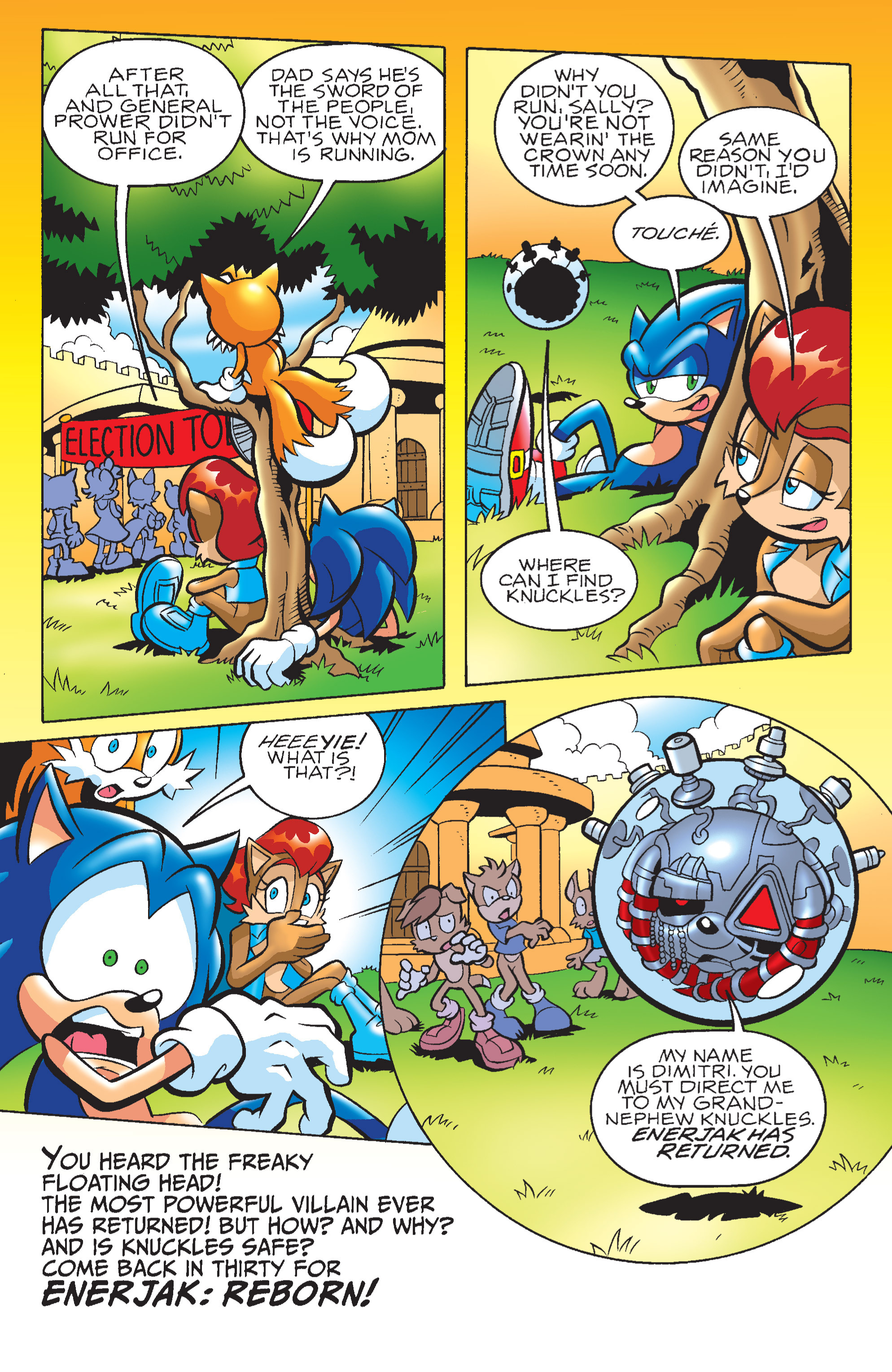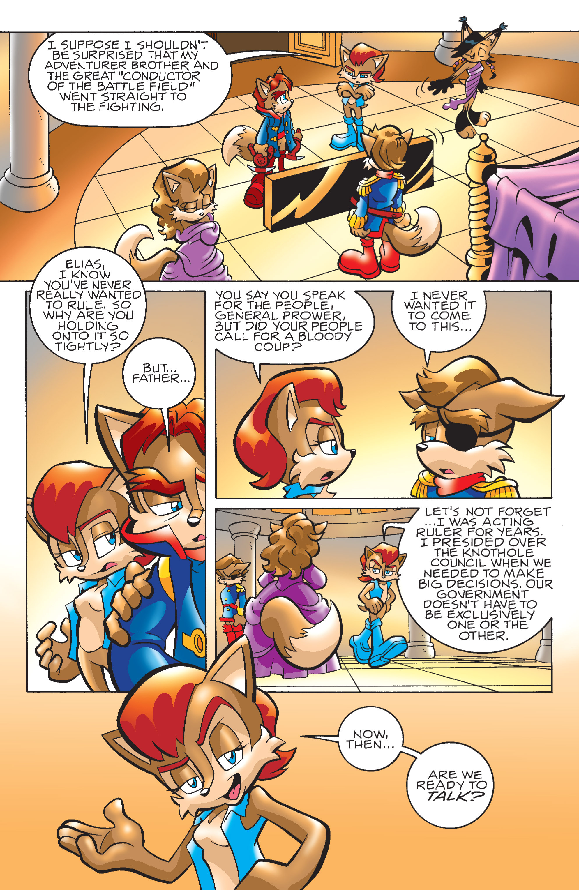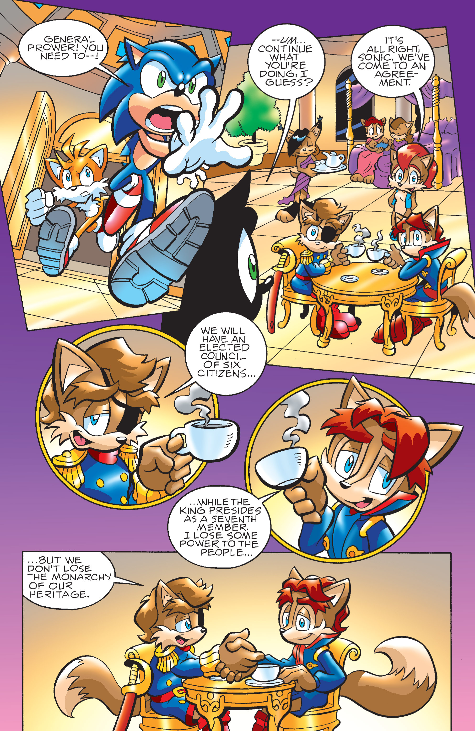 Mobiums? So, THAT’S your currency? Sonic and Tails would never break up! And the monarchy is advancing into a constitutional democracy! YIKES! The talking head bears news!