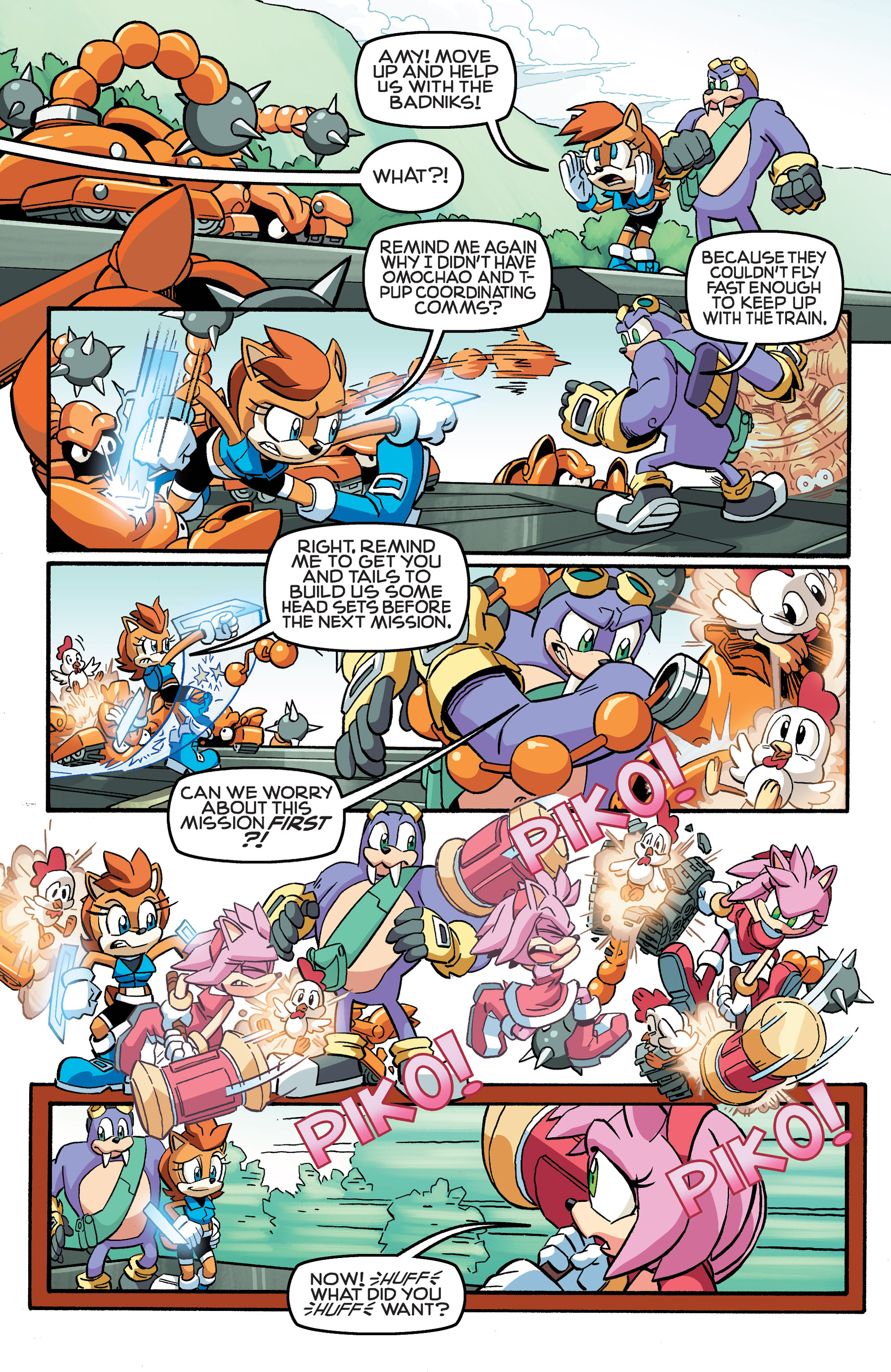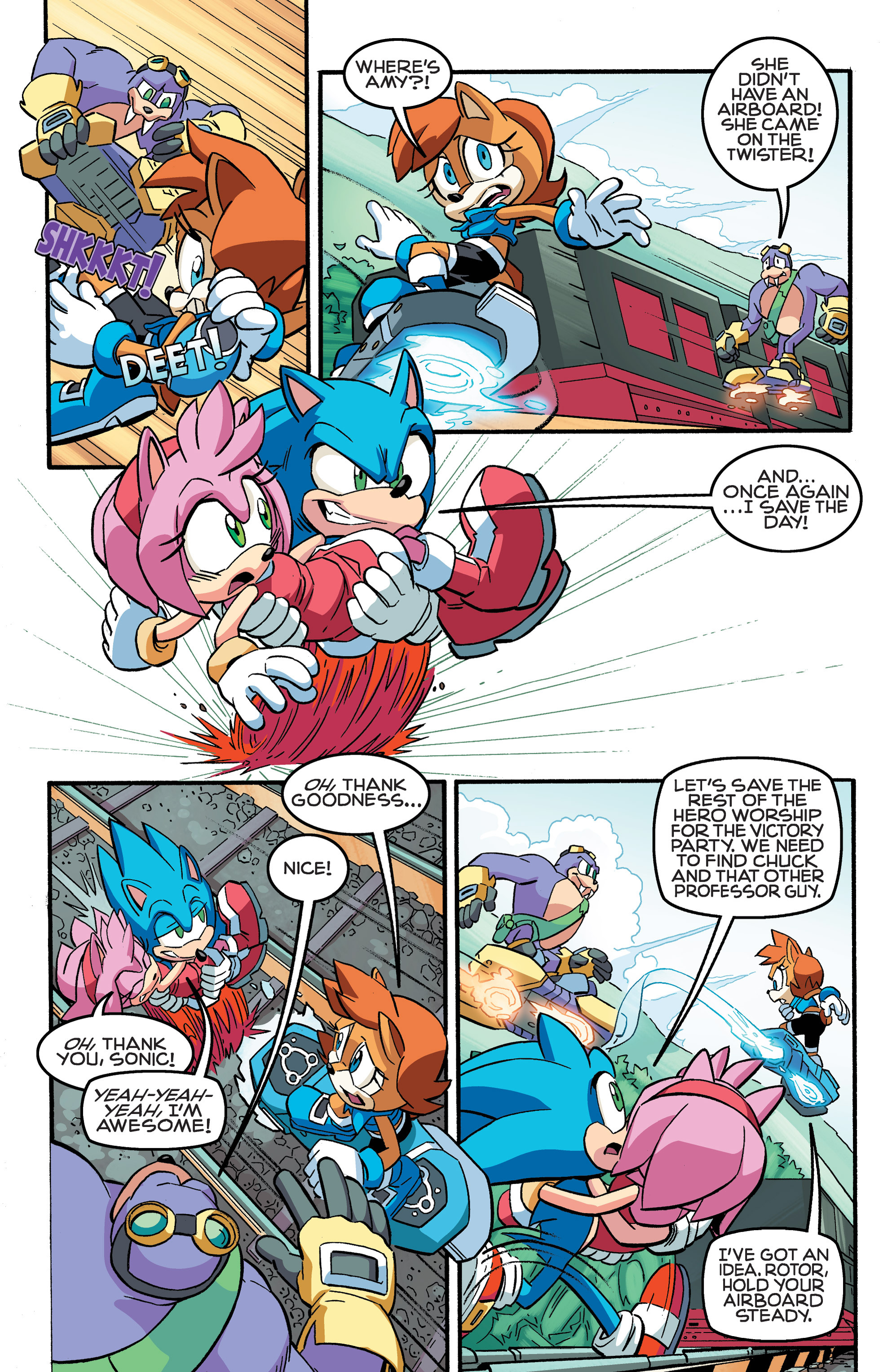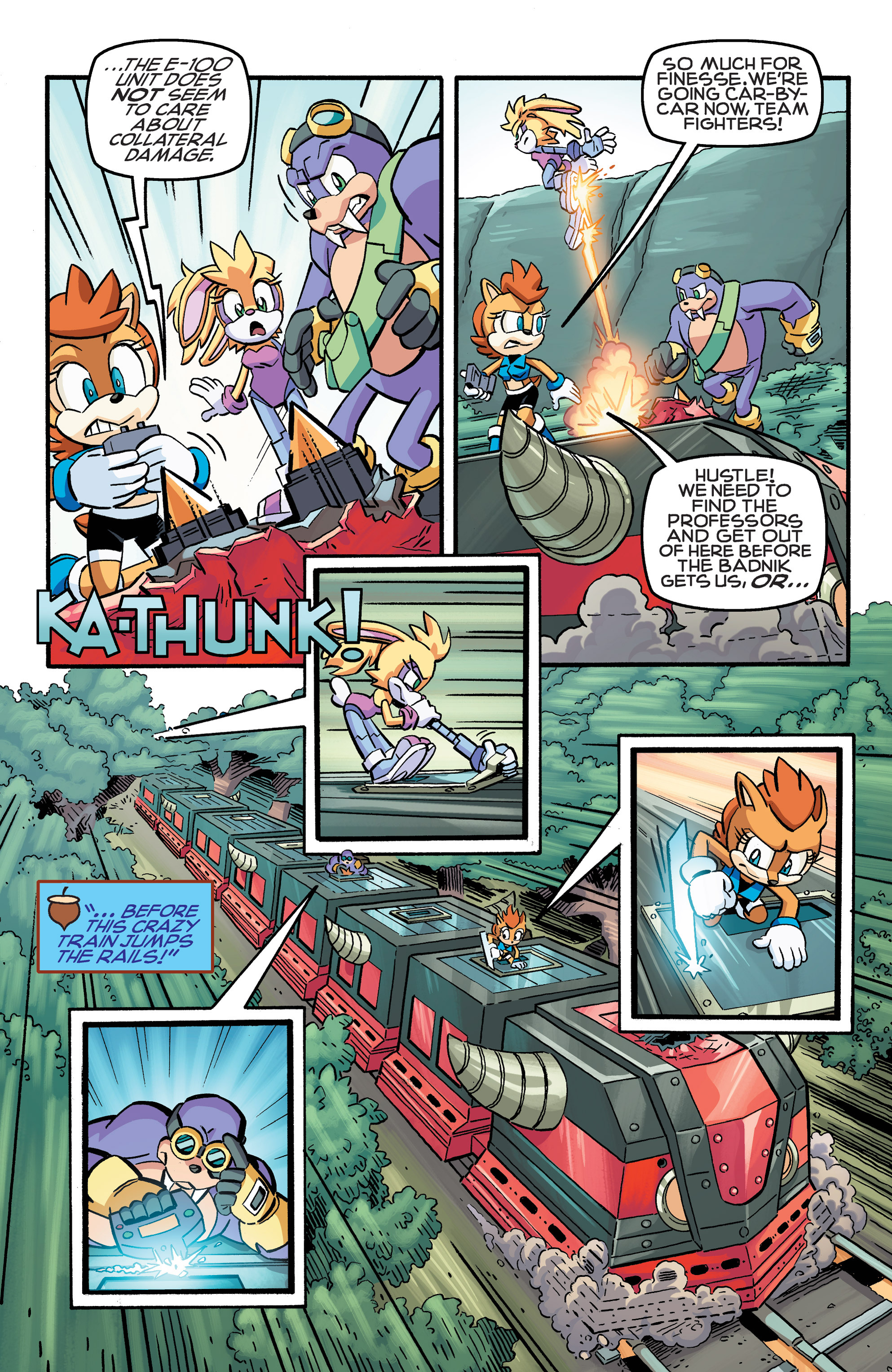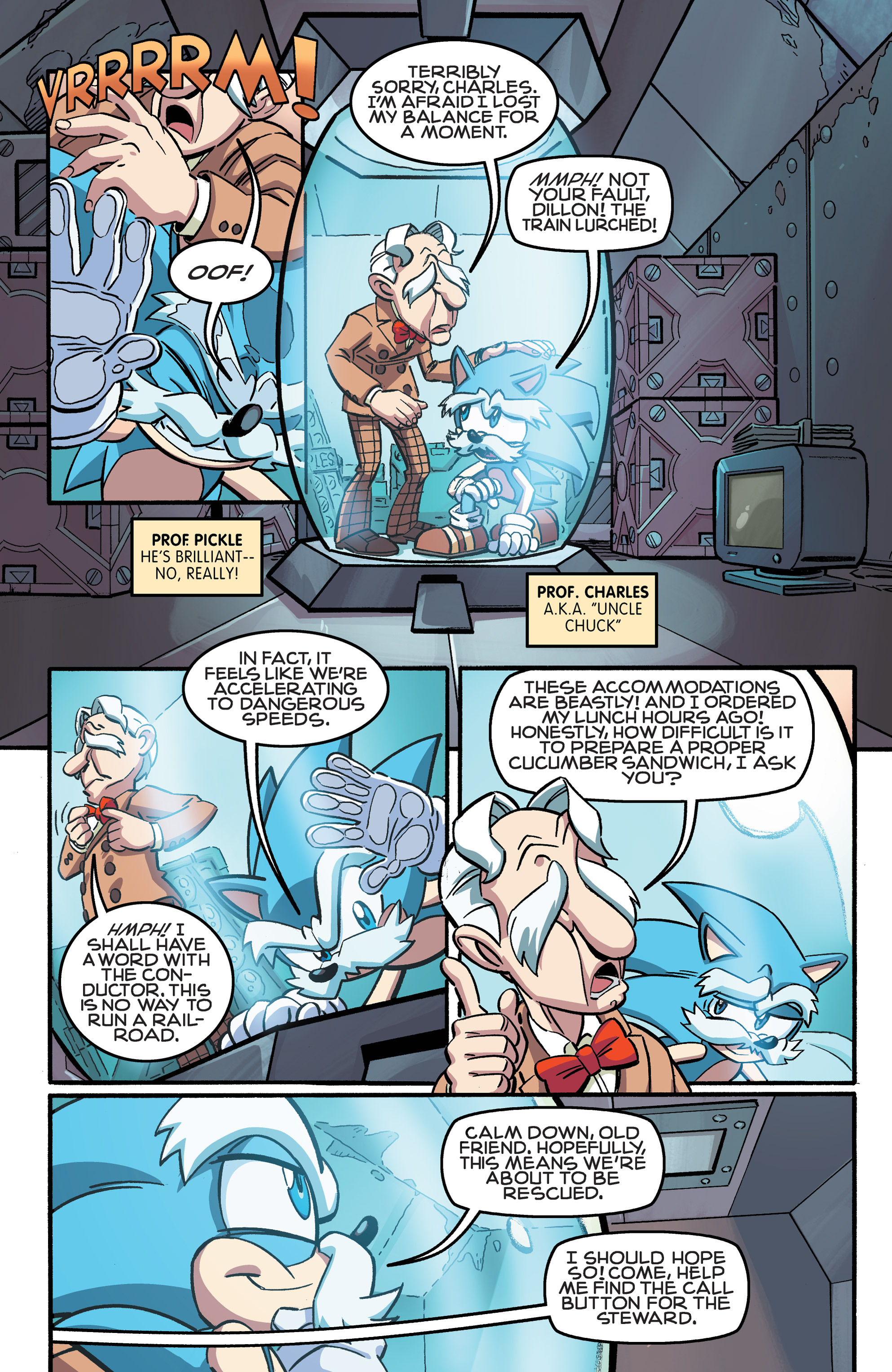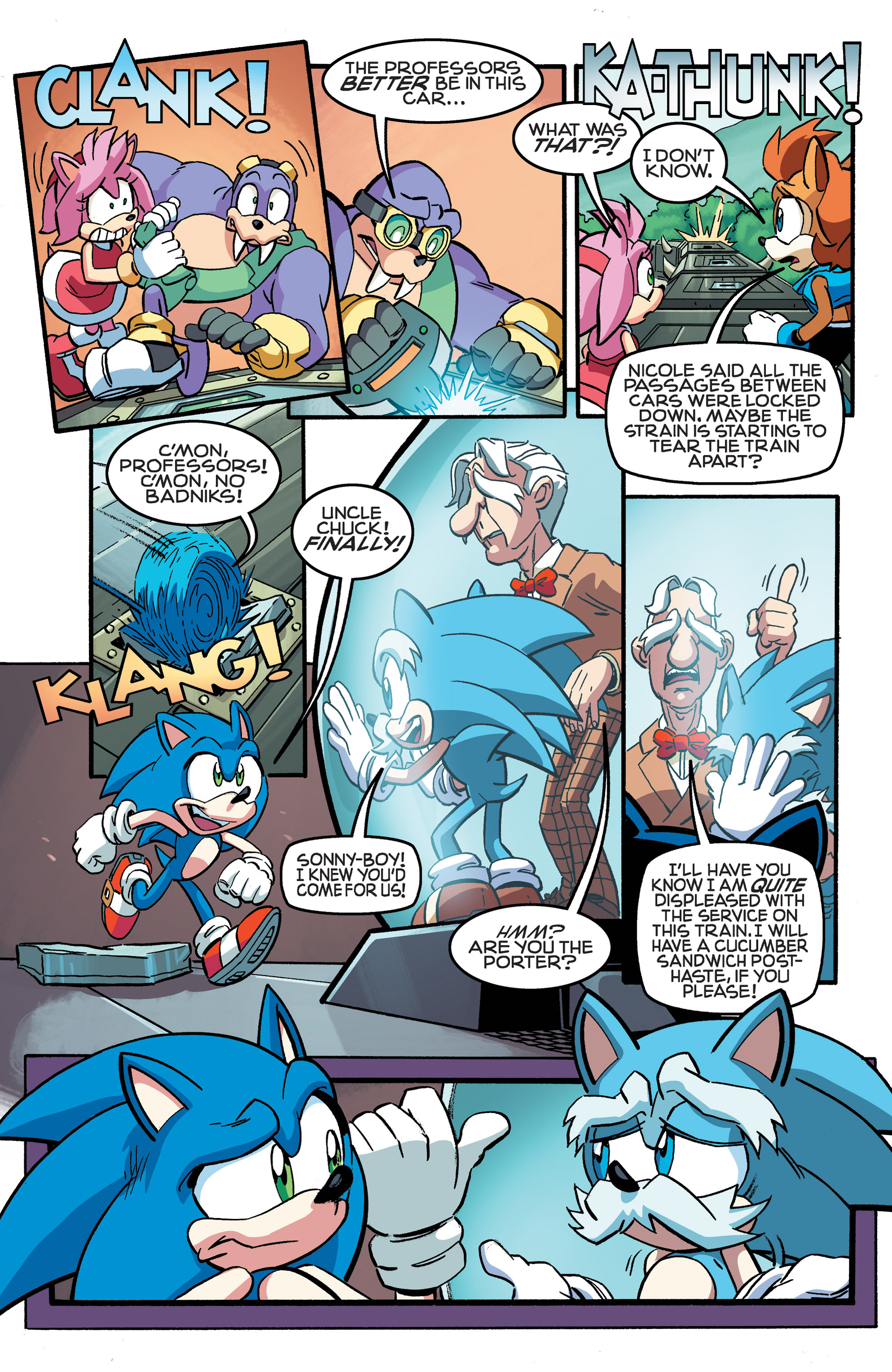 Hey, Soleanna Forest! And the train from Sonic Heroes! And we got a new E-Series member. Oh, Pickle, never change. HA HA HA, Amy nearly killed us all! So did Bunnie! “Epic sandwich ingredient,” WE FOUND THE CUCUMBER SANDWICH! Also, just realized Chuck must’ve been named after Chuck Thorndyke.