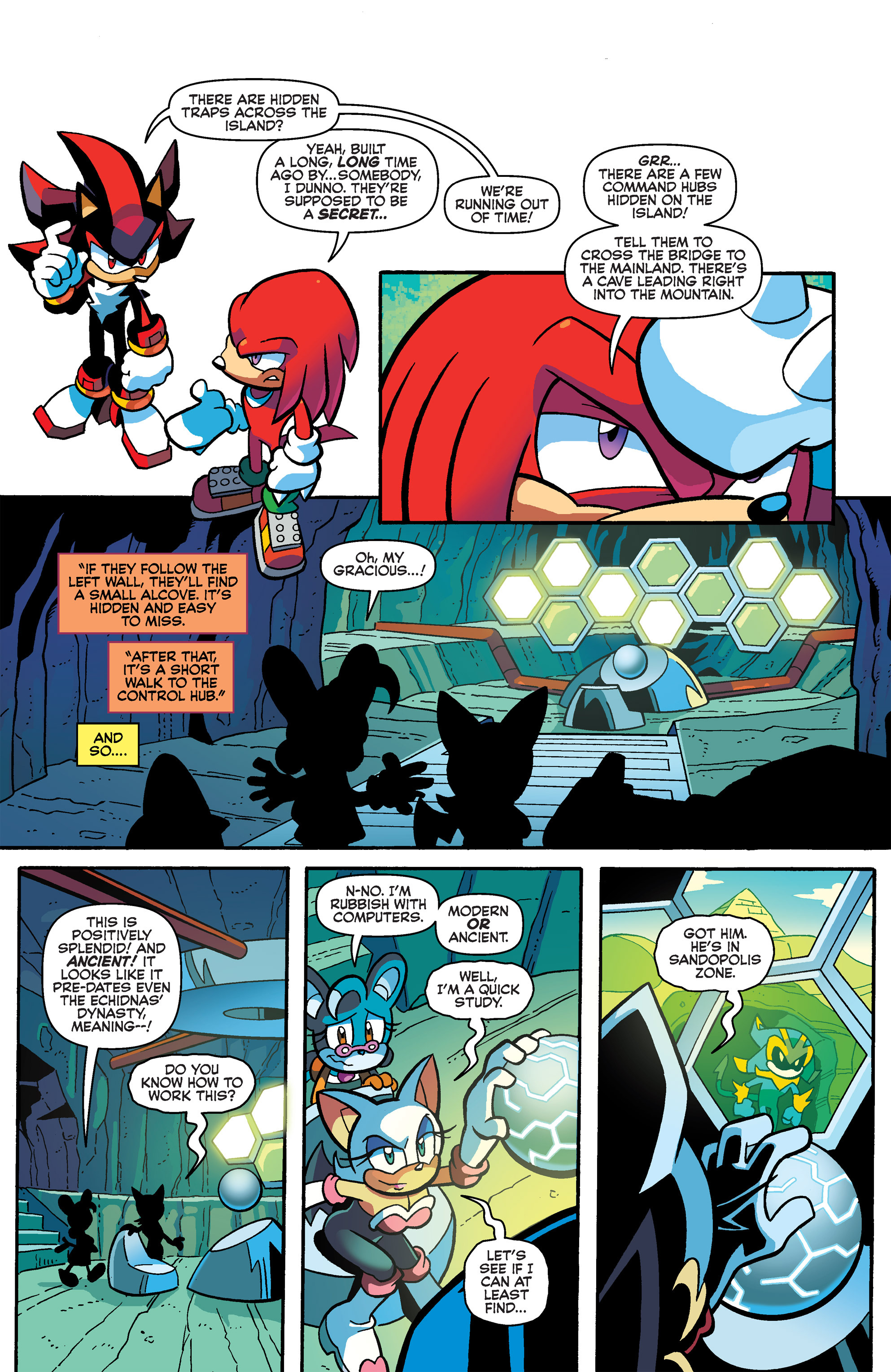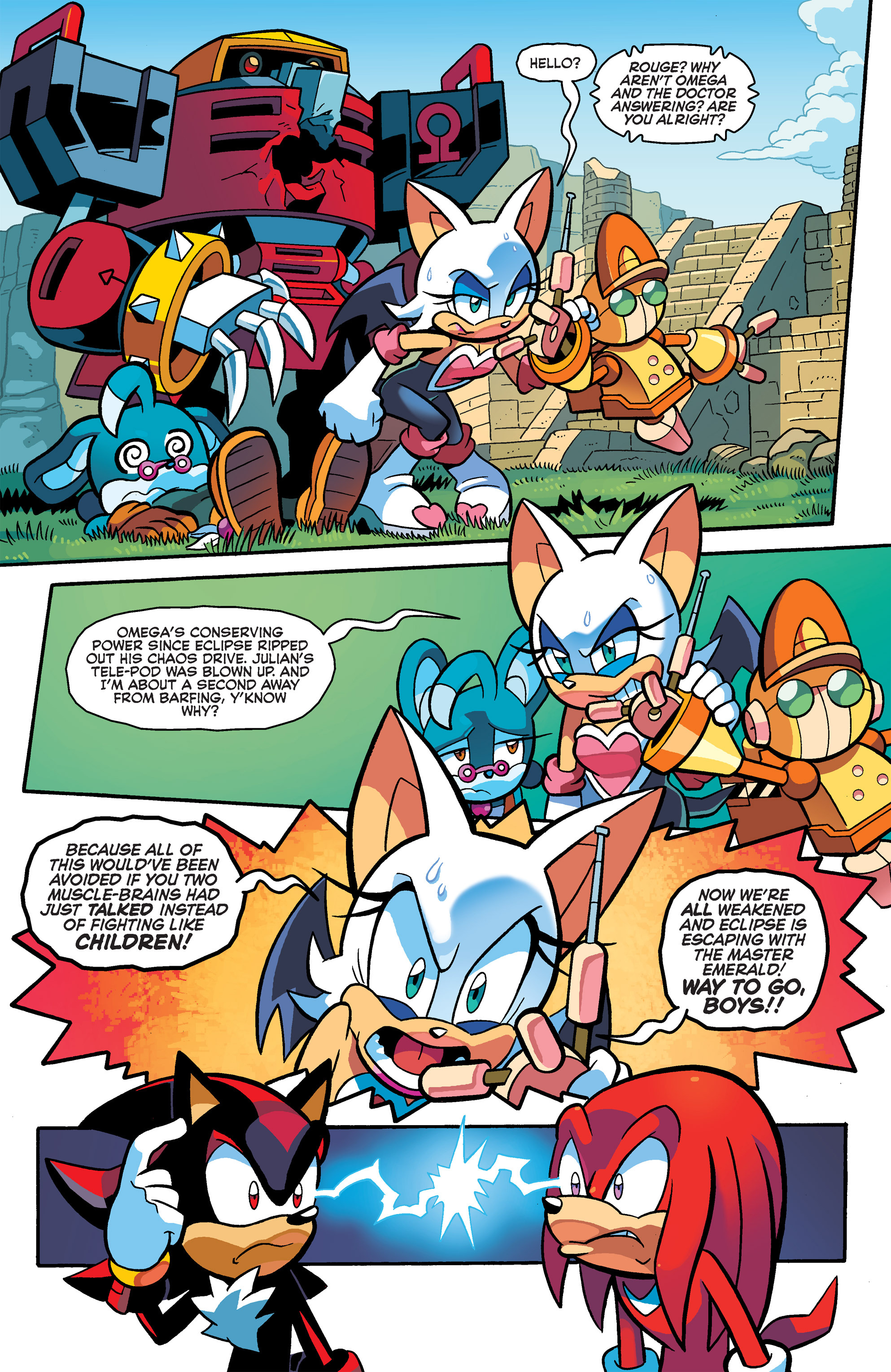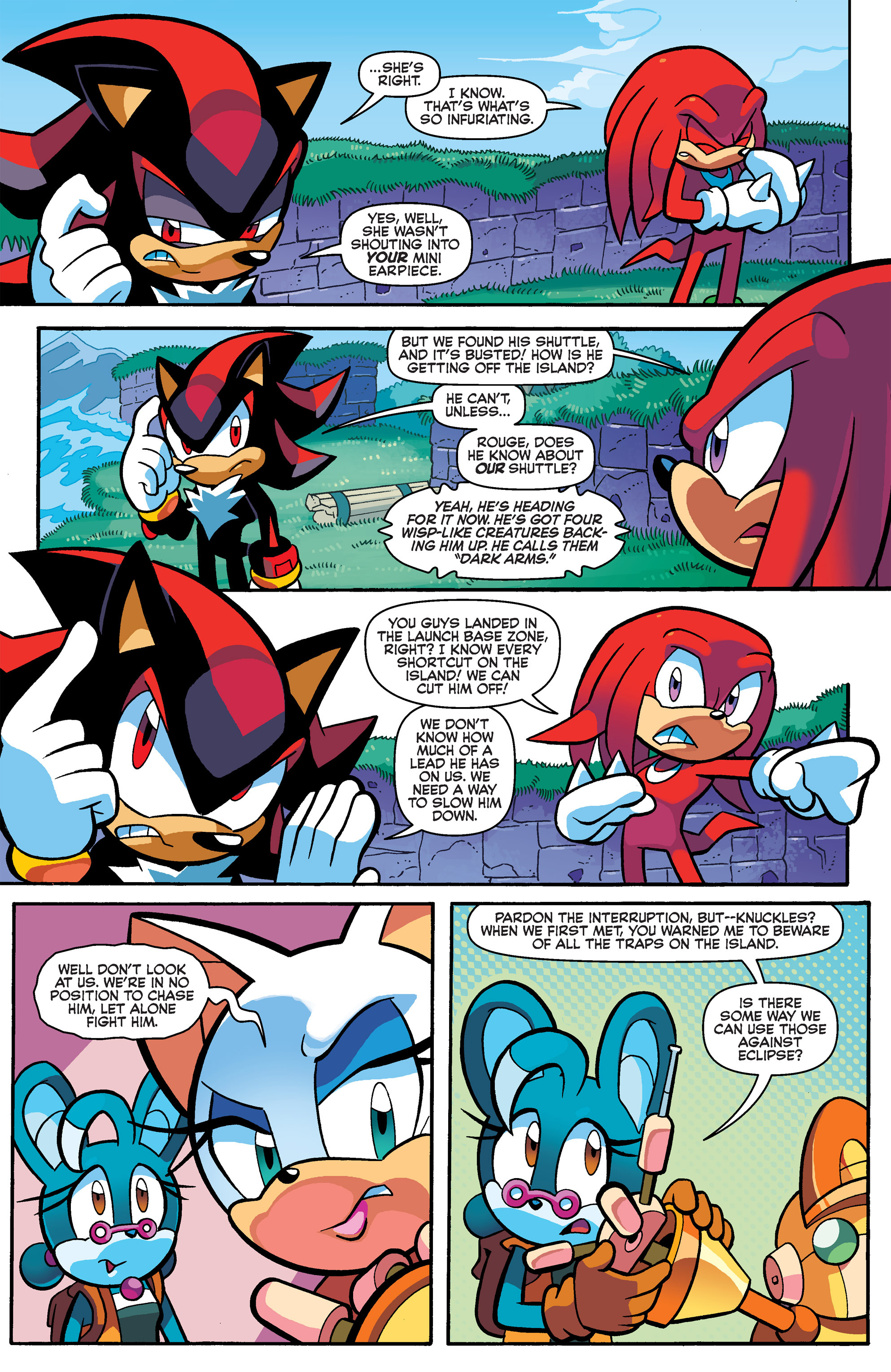 Haha, Shadow helps him out, but they’re back to fighting! So, that control hub was built by the Ancients from Starfall Islands? Hah, Knuckles and Shadow had fun in Carnival Night! I guess Lanolin wasn’t the first to use a Magenta Wisp like that. Good call, Knuckles, good call.