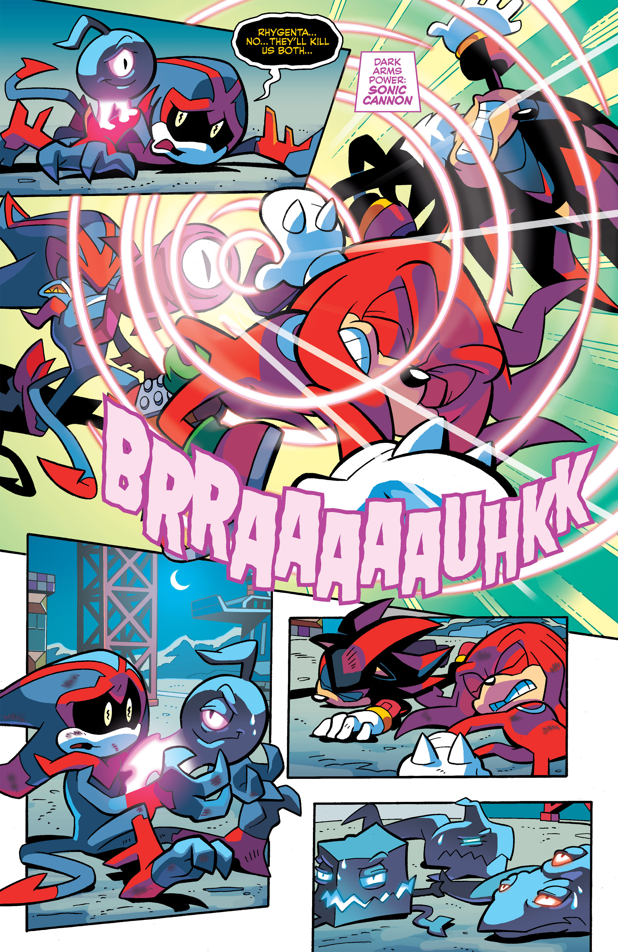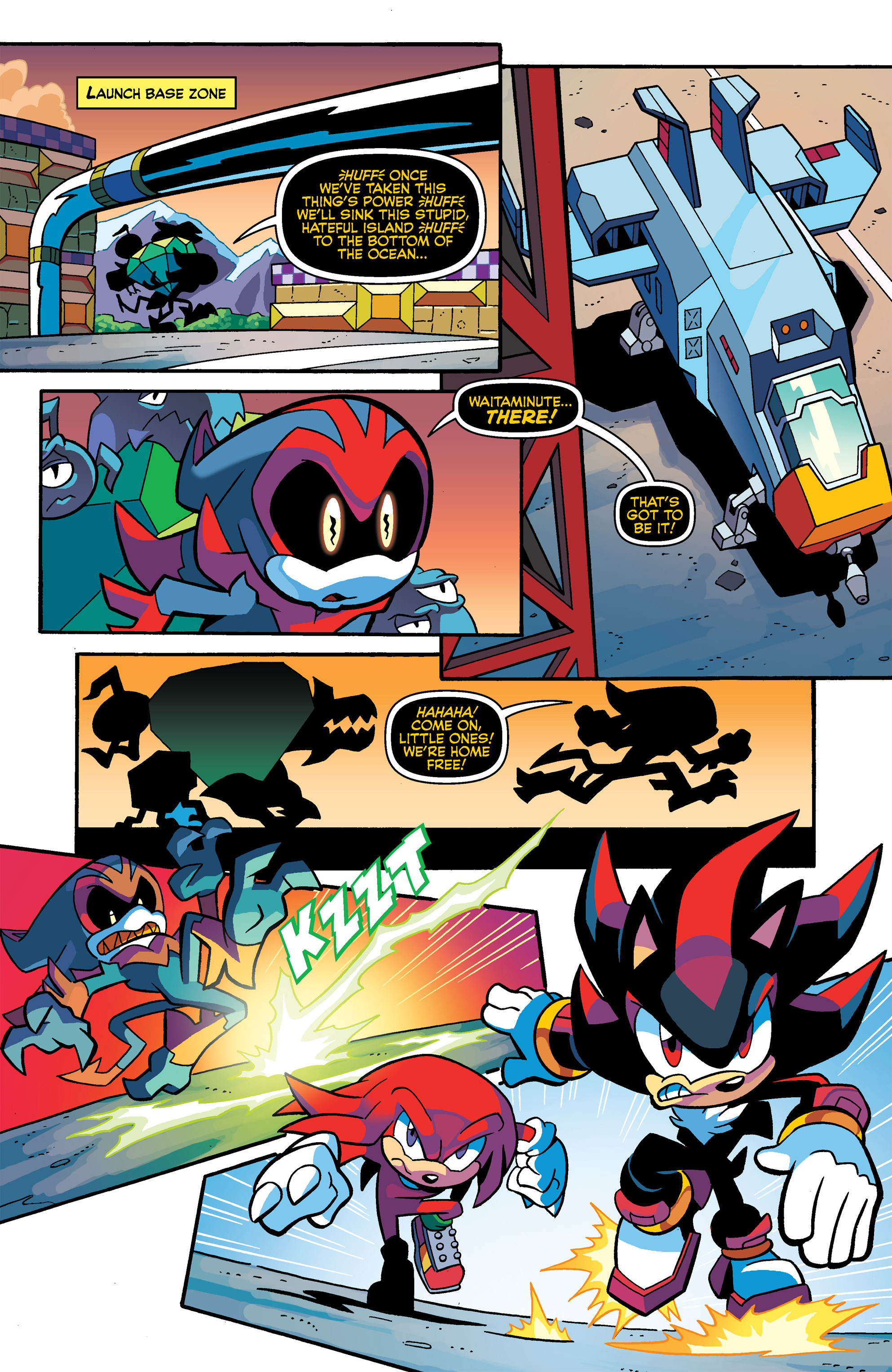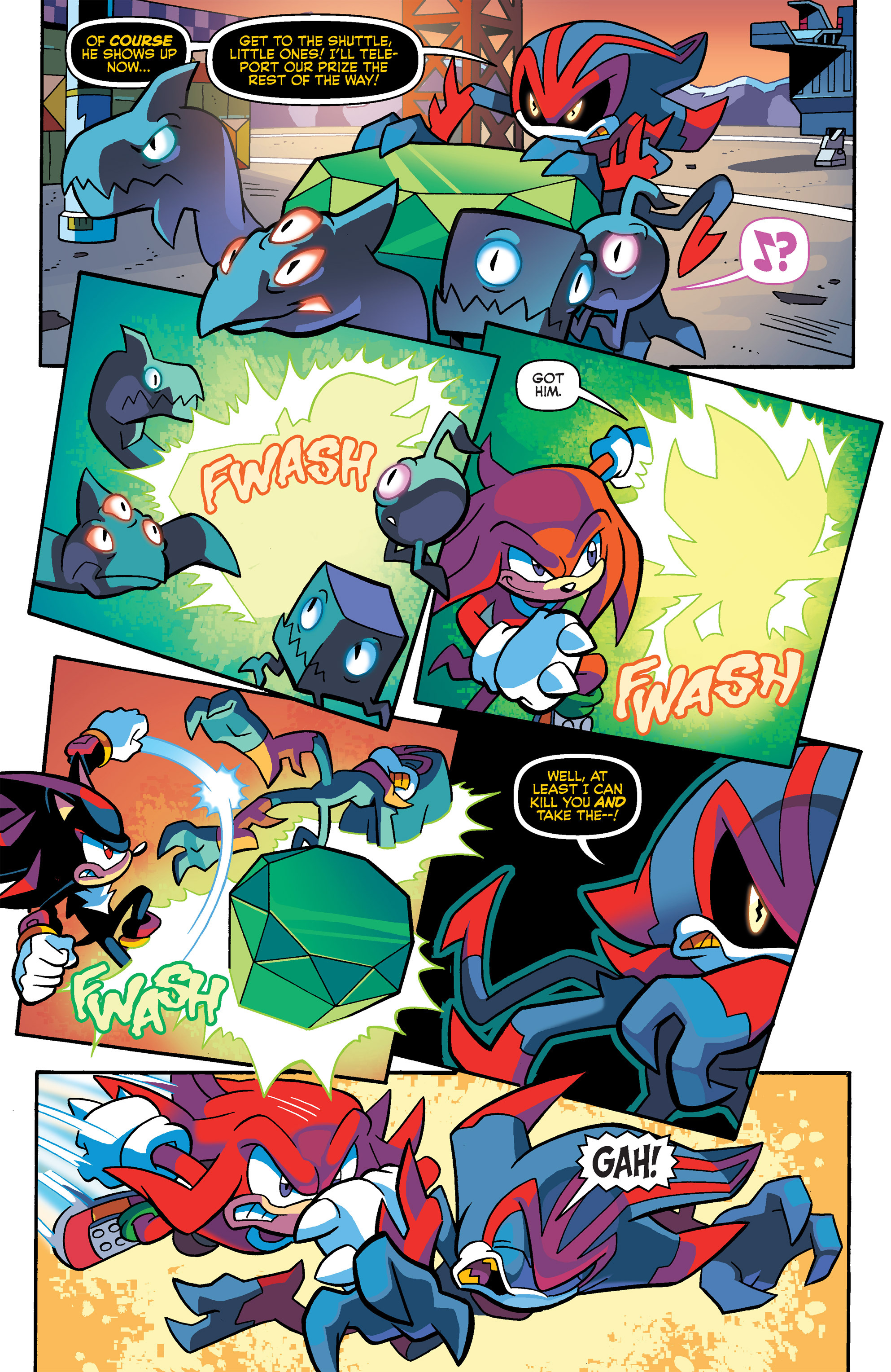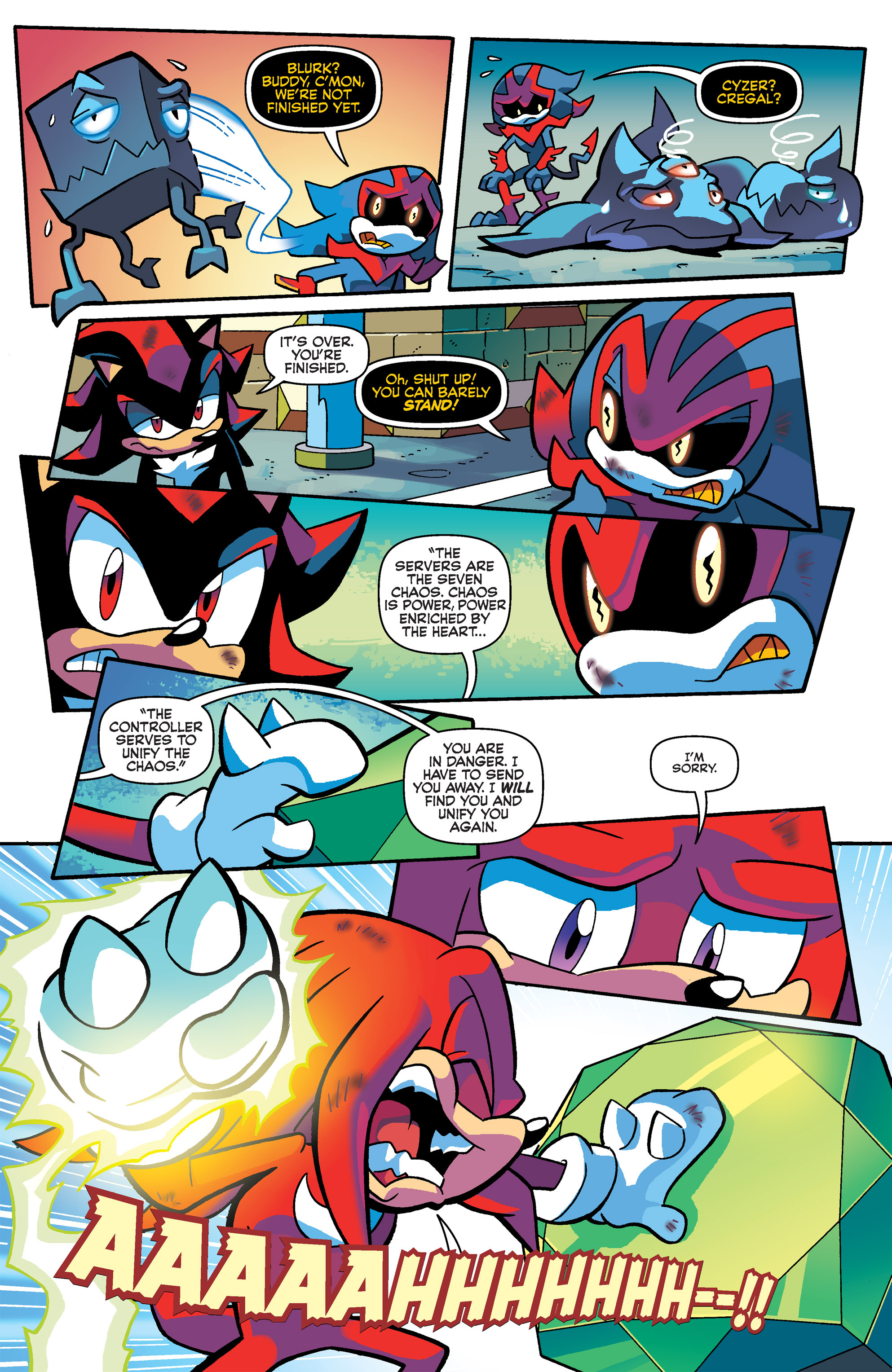 Haha, Shadow helps him out, but they’re back to fighting! So, that control hub was built by the Ancients from Starfall Islands? Hah, Knuckles and Shadow had fun in Carnival Night! I guess Lanolin wasn’t the first to use a Magenta Wisp like that. Good call, Knuckles, good call.